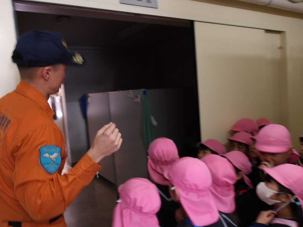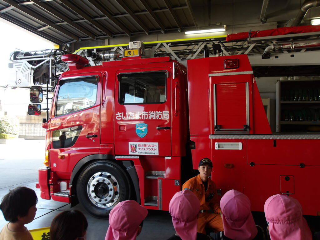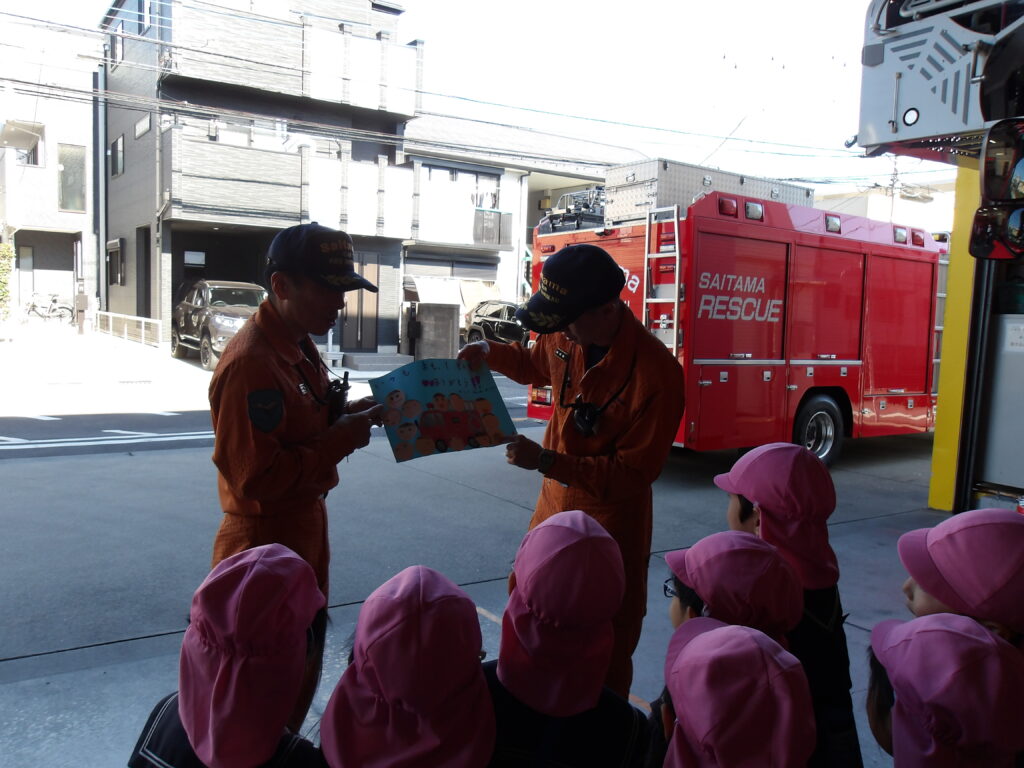 らいおん組消防署見学 2025-11-26 11月17日(月)らいおん組消防署見学に行ってきました。 はしご車、ポンプ車、救急車の中を見せてもらいました。 はしご消防車に大興奮な子どもたち!! 消防署内も見学させてもらいました。 質問タイムもあり、聞きたかった質問にたくさん答えてもらいました。 「どんな訓練をしているのですか?」「1年間でどのくらい火事が起こるのですか?」など質問をしている子もいて感心しました。 最後に消防士の方に、感謝の気持ちを込めてプレゼントを渡しました。