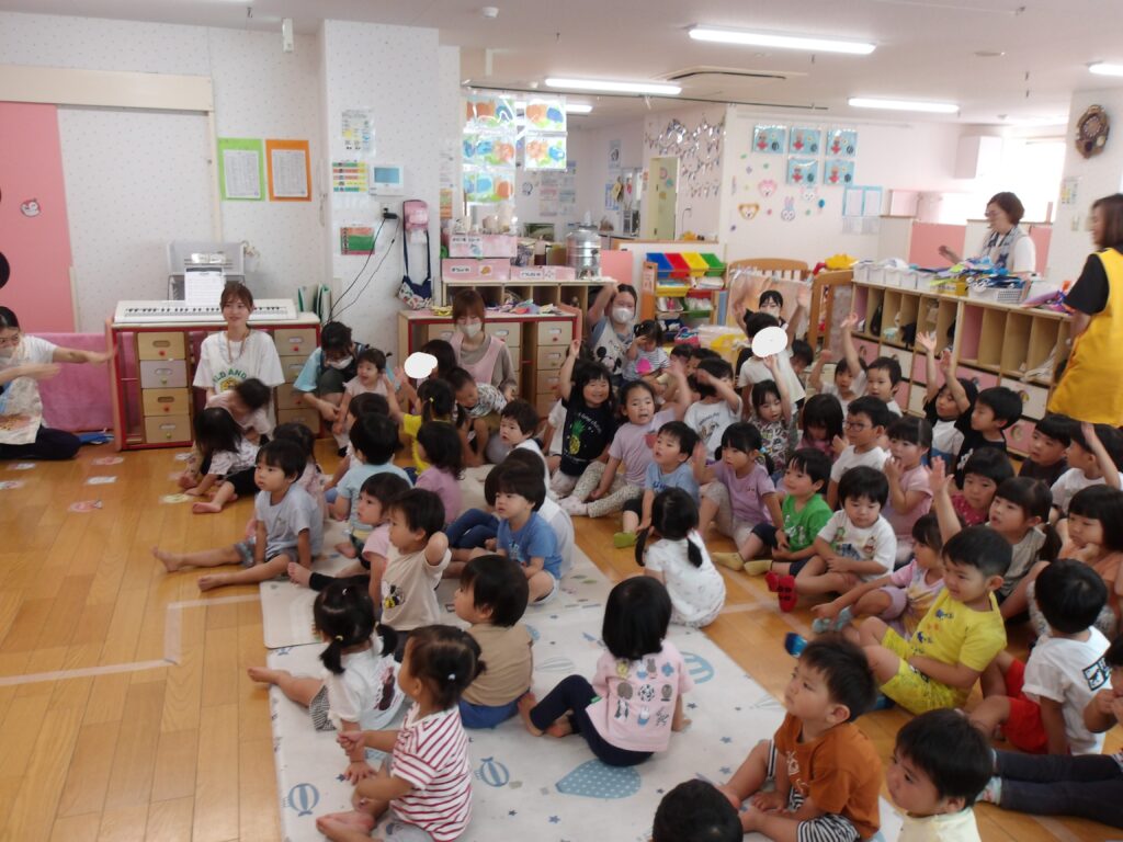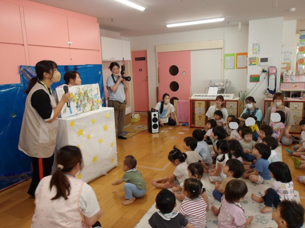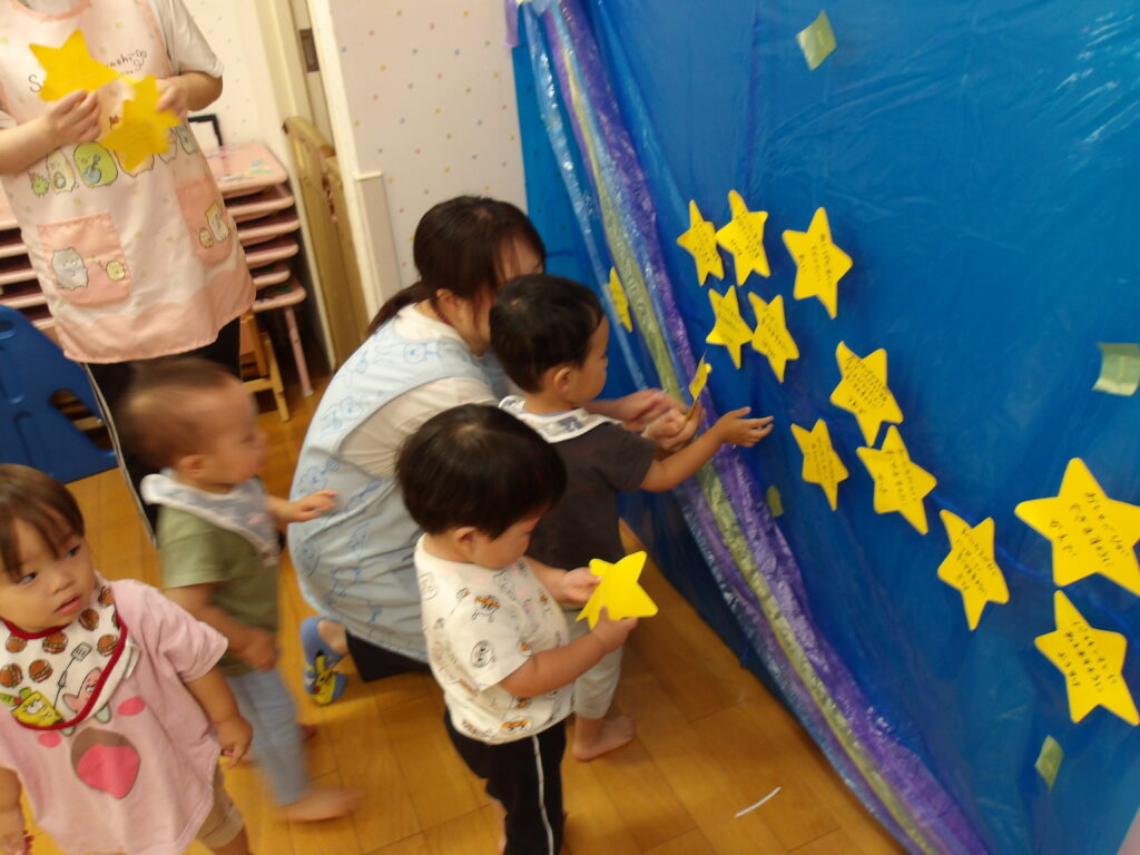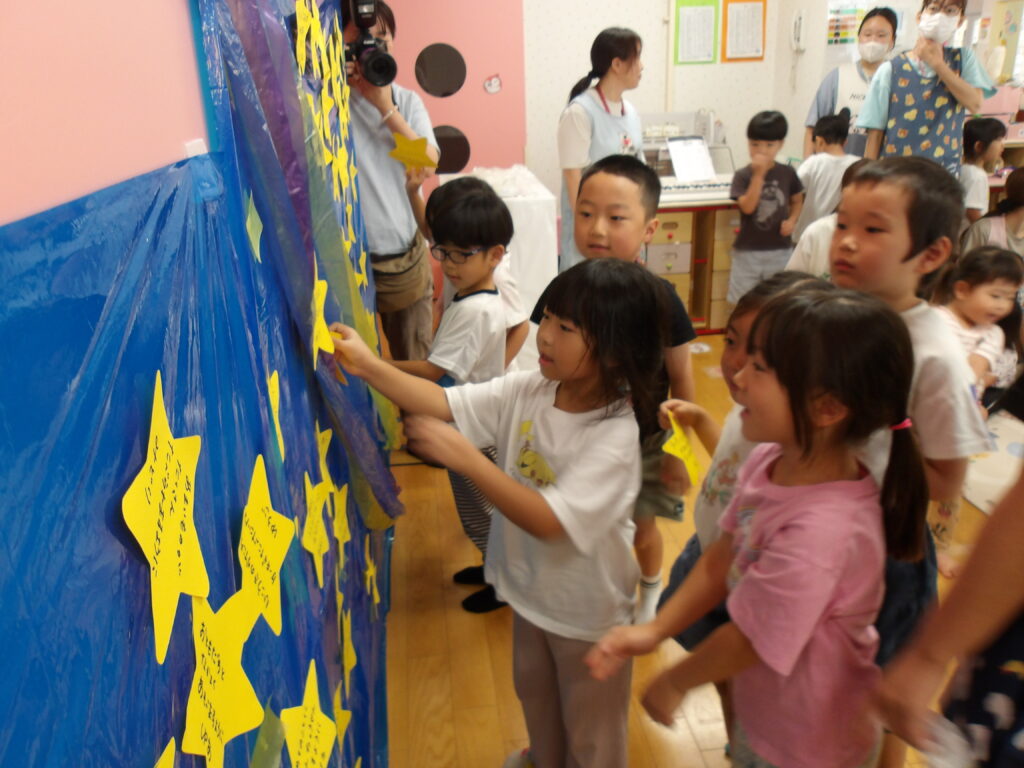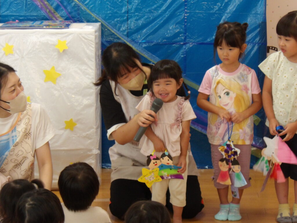 七夕集会☆彡 2025-10-14 7月7日、今年は七夕当日に七夕集会を行いました★ 初めに製作発表を行いました。 どのクラスも雰囲気の違った可愛らしい作品が出来ました♪ そのあとは全員で七夕の絵本を見ました。 七夕2択クイズは大盛り上がり。 正解すると「やったー!」と嬉しそうに喜んでいました。 最後に大きな天の川にみんなのお願い事を貼りました。 みんなの願い事が叶いますように☆ 終わった後には、「またやりたい!」と 来年の七夕を楽しみにしている子どもたちでした。
