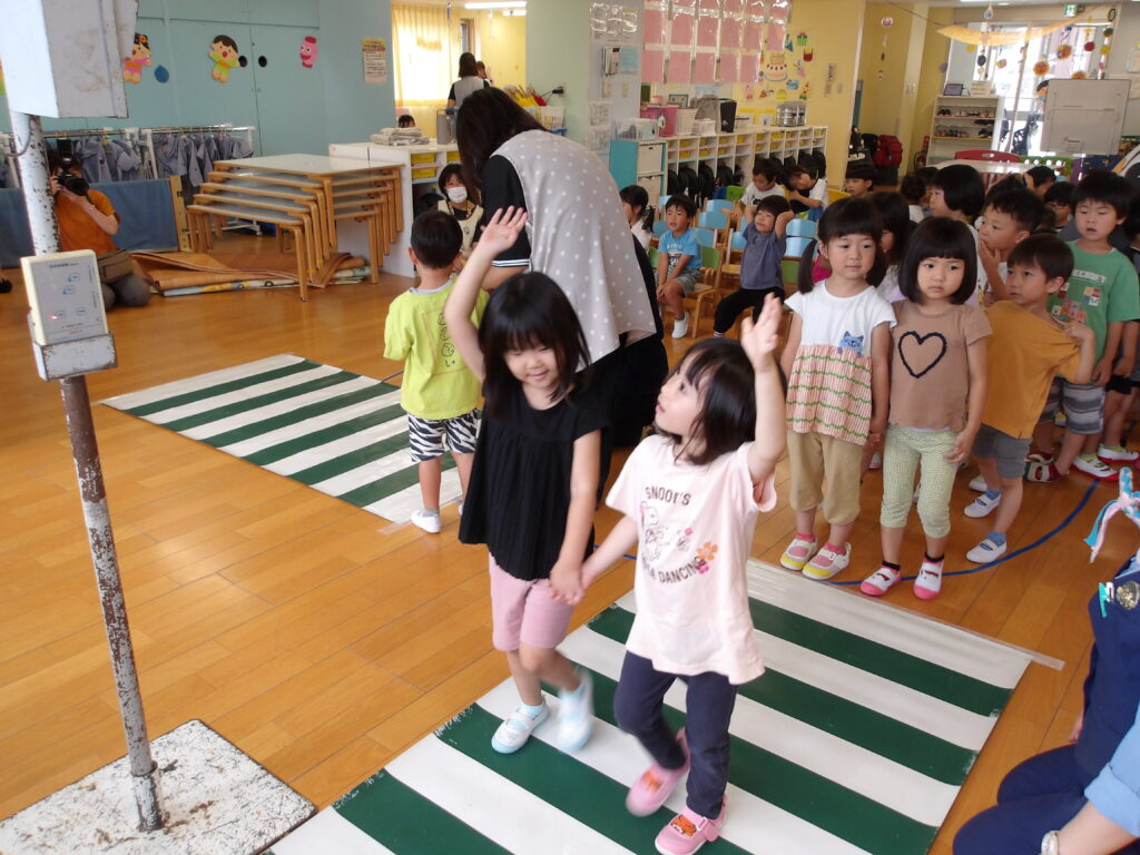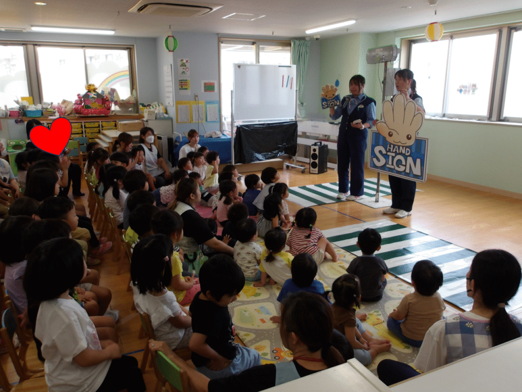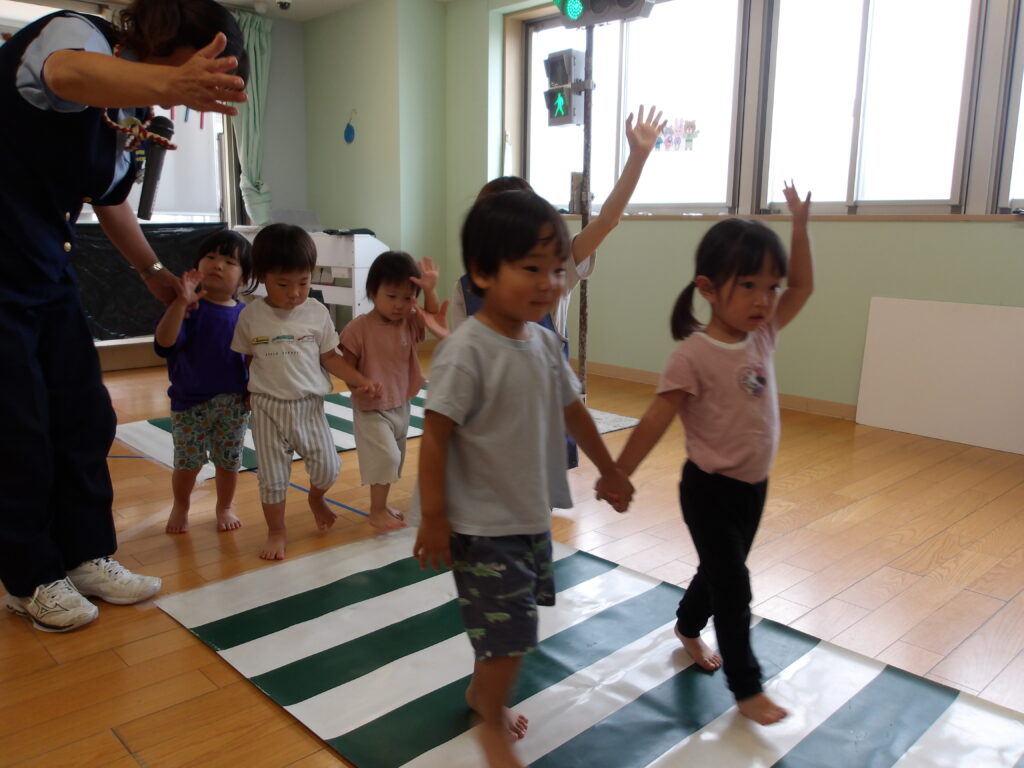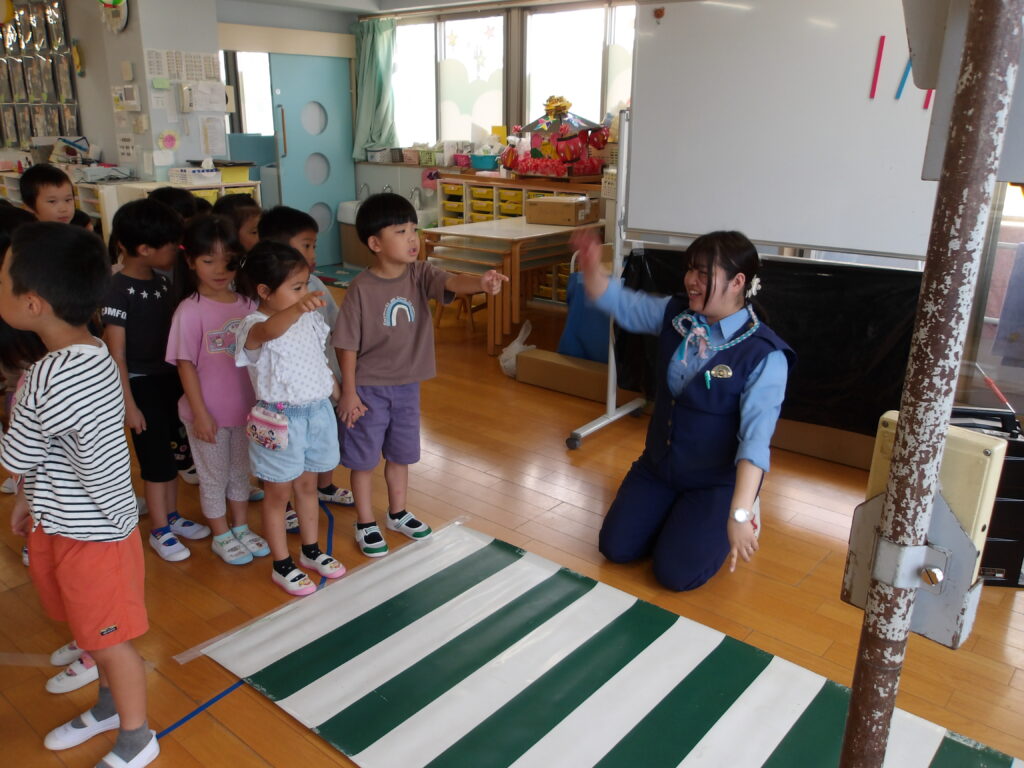 憧れの「おまわりさん」を目の前にし、特に幼児クラスのお友だちは真剣に話に聞き入る姿が見られました。また、「交通ルール」という少し難しいテーマですが乳児クラスのお友だちも参加することで、少しずつ、簡単な部分から意識していけるように促しています。