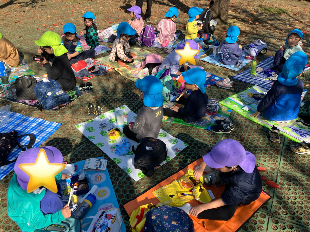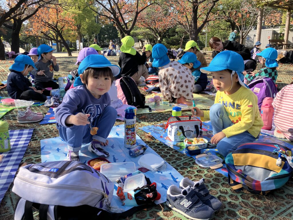その後は楽しみにしていたお弁当。「僕のにはおにぎりが入ってるよ!」「私のはフルーツもある!」など自分のお弁当の中身を友達と伝えあう姿が見られほほえましかったです。