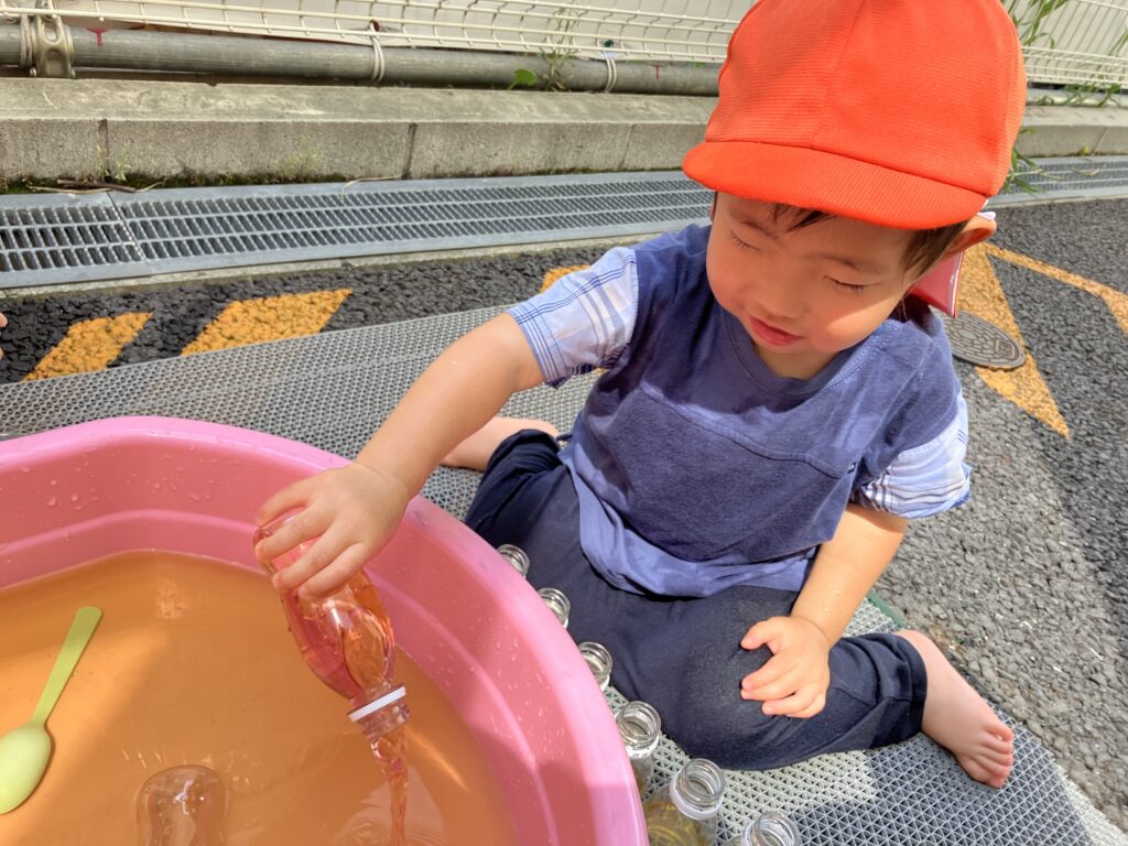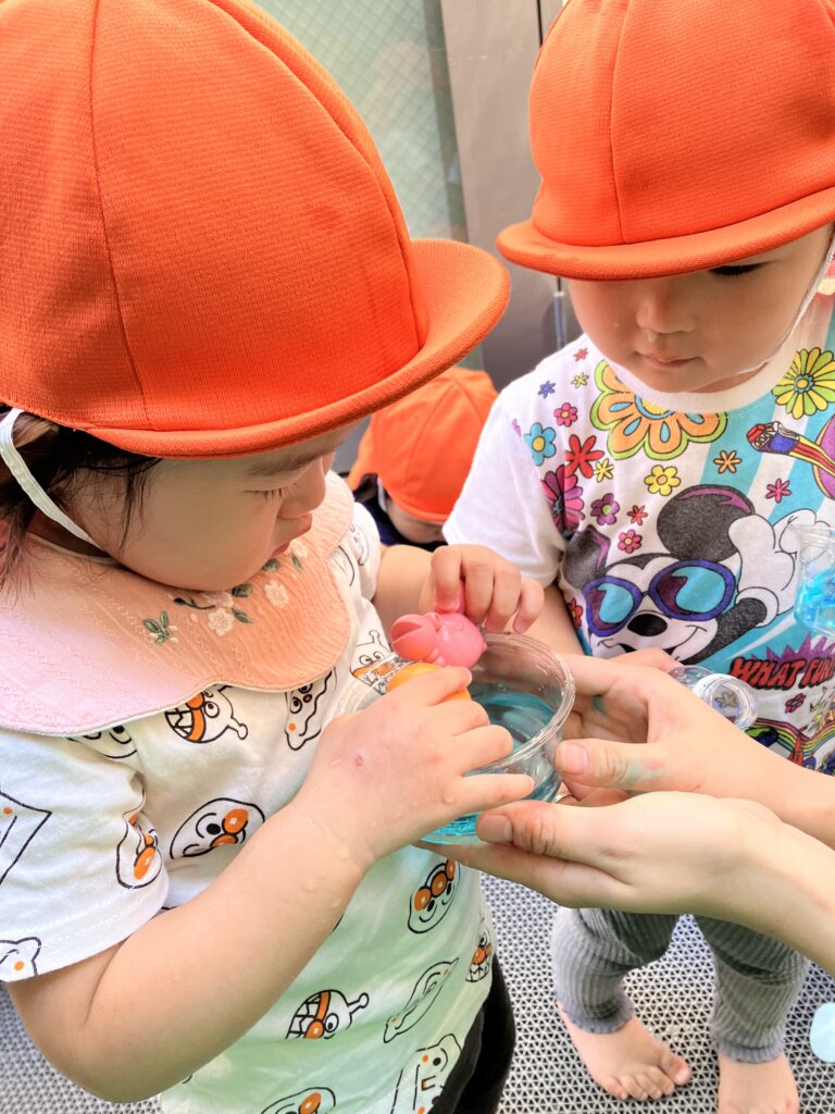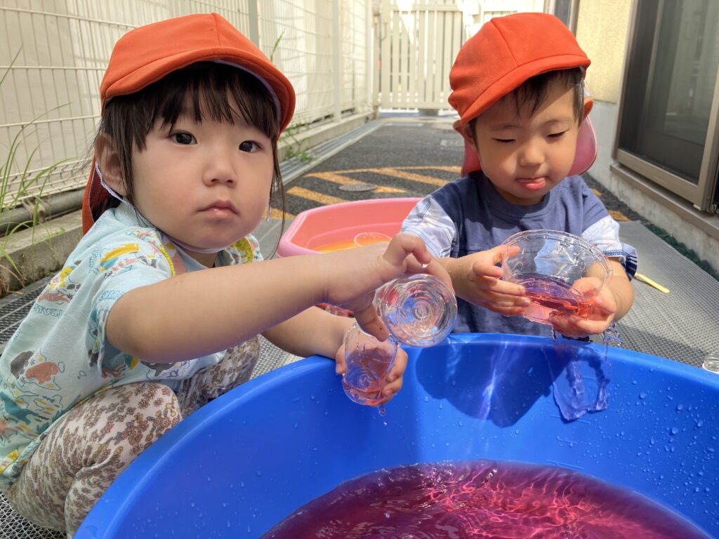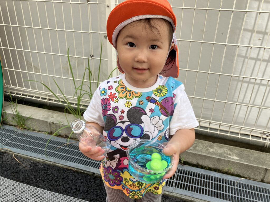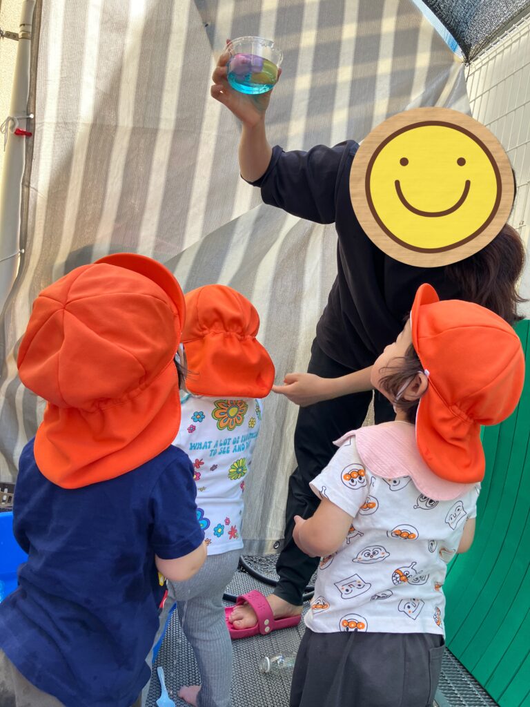 色水遊び(りす組) 2025-09-30 色水遊びをしました。透明な水に絵の具を入れると、すぐに赤や青、黄色の色水に変身! 黄色と赤を混ぜたら何色になるかな? 今度は青色と緑色を混ぜてみよう! 青色のお水に魚を浮かべて「水族館みたい」と見せてくれました☆ 魚のおもちゃを色水に浮かばせては、「水族館みたいだね」と目を輝かせていました。色水を光に当ててみると綺麗に透けていて「きれいだね」とみんなで集まって観察していました。 夏ならではの遊びを存分に楽しむことができました。