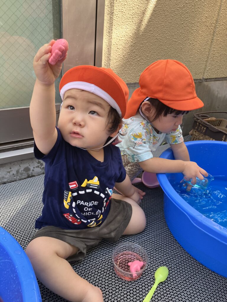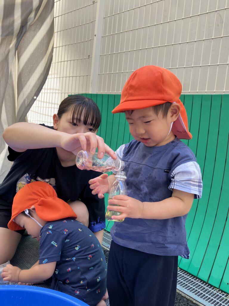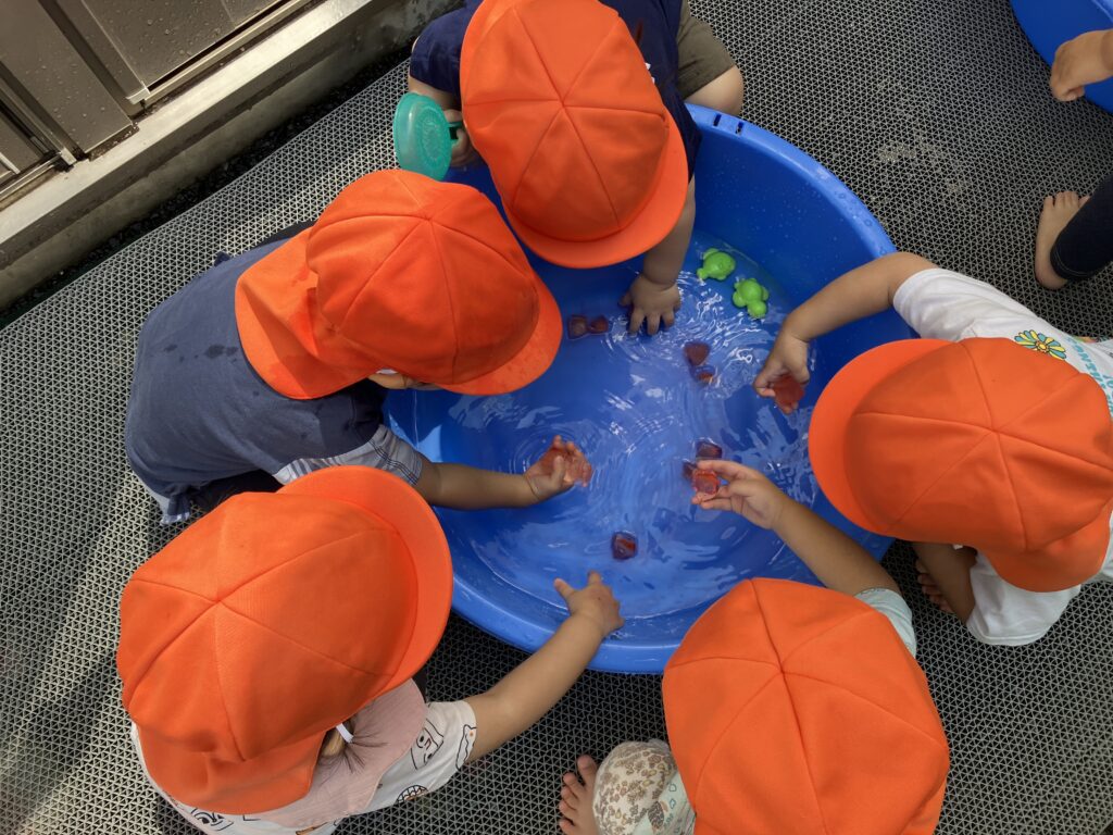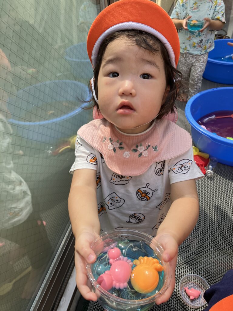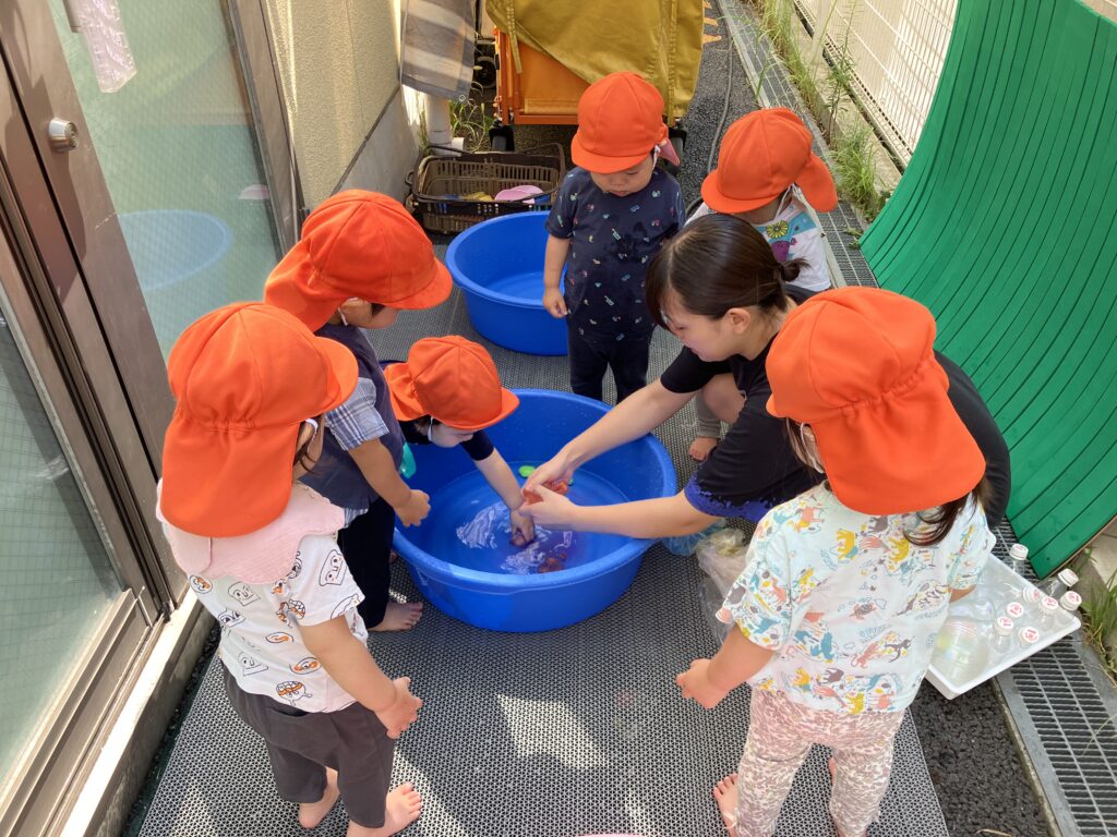 色水遊び(りす組) 2025-09-30 色水遊びをしました。透明な水に絵の具を入れると、すぐに赤や青、黄色の色水に変身! 黄色と赤を混ぜたら何色になるかな? 今度は青色と緑色を混ぜてみよう! 青色のお水に魚を浮かべて「水族館みたい」と見せてくれました☆ 魚のおもちゃを色水に浮かばせては、「水族館みたいだね」と目を輝かせていました。色水を光に当ててみると綺麗に透けていて「きれいだね」とみんなで集まって観察していました。 夏ならではの遊びを存分に楽しむことができました。