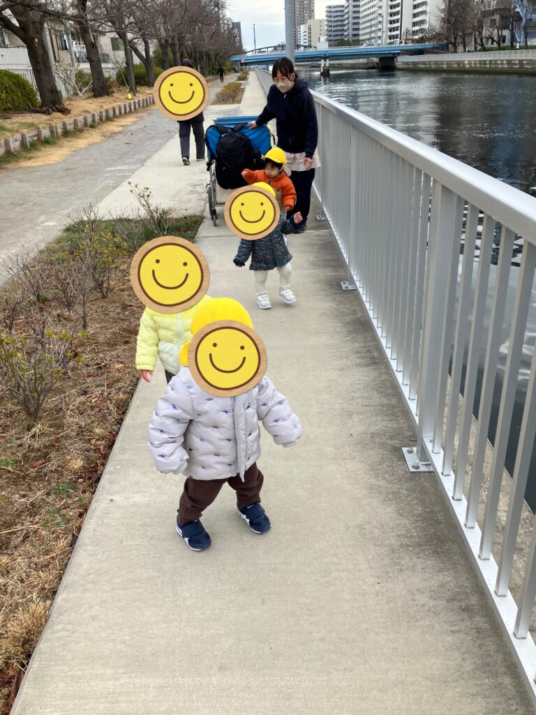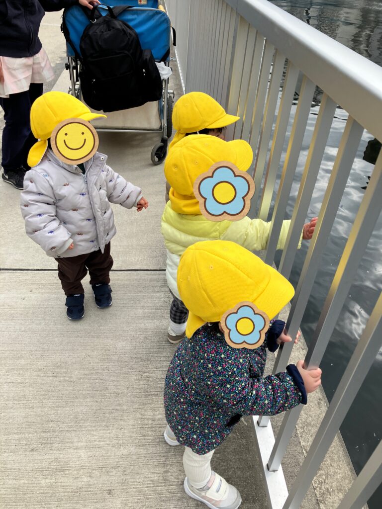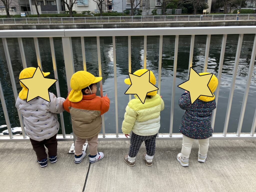 鳥さんいるかな?(ひよこ組) 2026-02-28 高橋までお散歩に行きました。順番に手を繋いで歩けるようになりました。 川の様子をみんなでのぞいている後ろ姿は、可愛らしいです。 あそこに鳥さんいたよーと教えてくれています♪ みんなでよーいどん!で端っこまで、元気に競争しました。