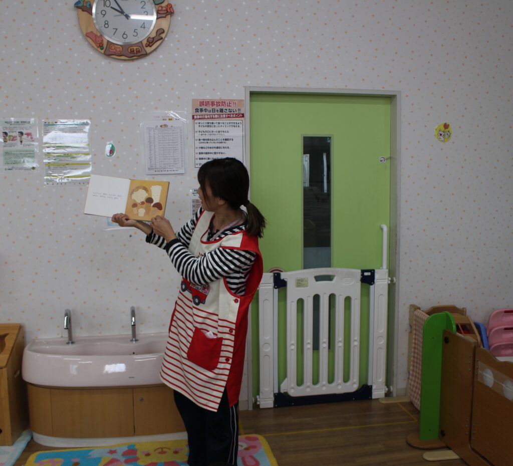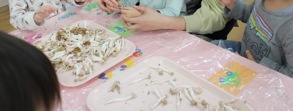 きのこが出てくる絵本を真剣に見ている子どもたち。
