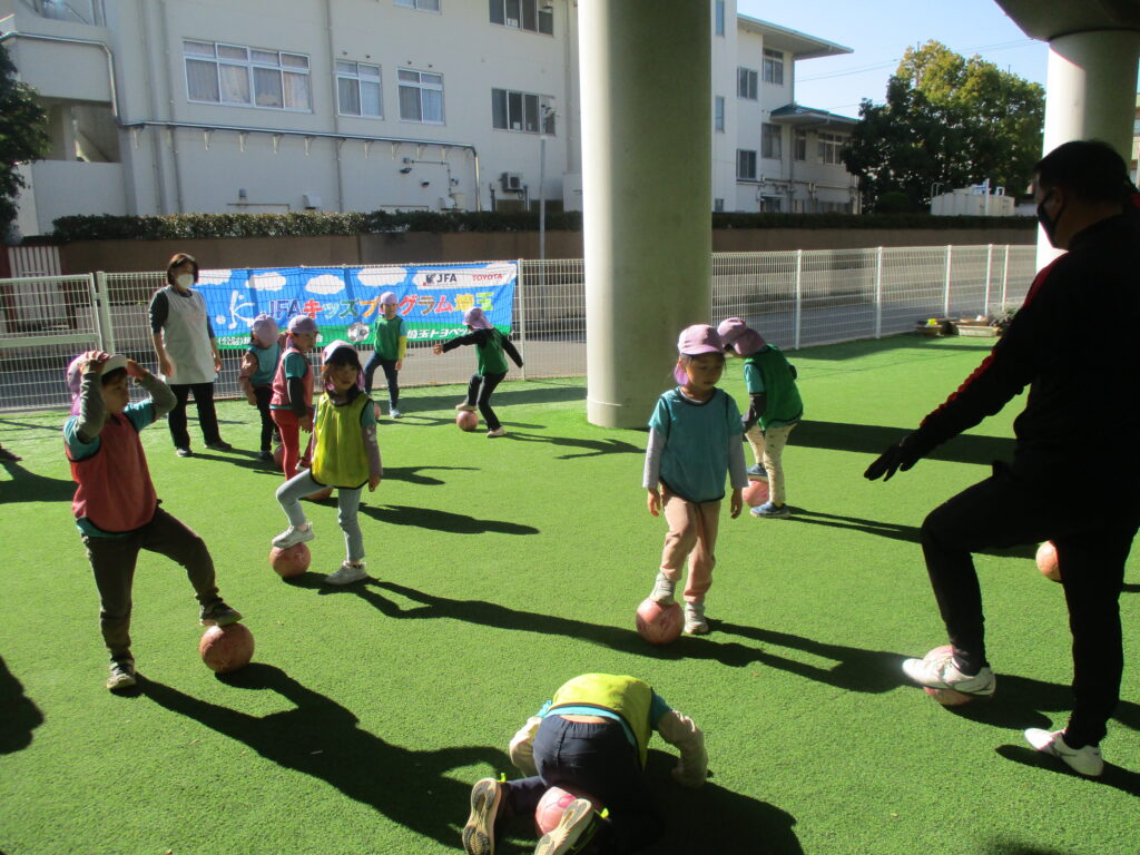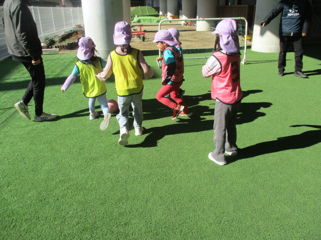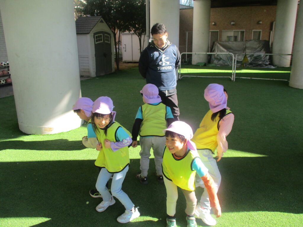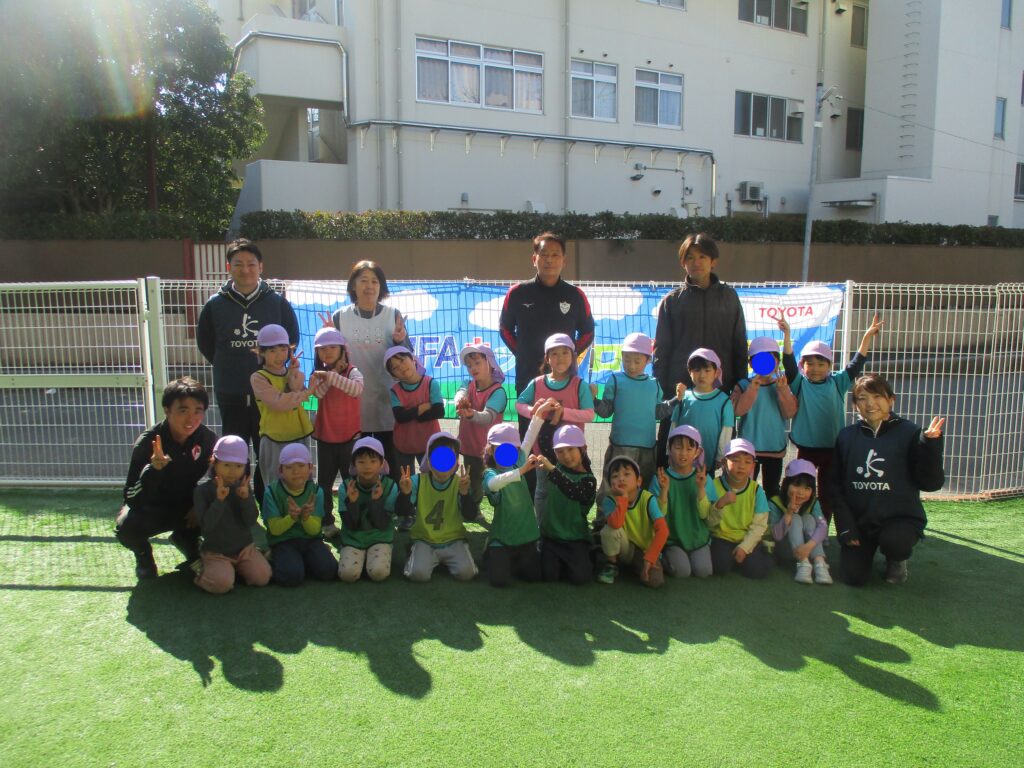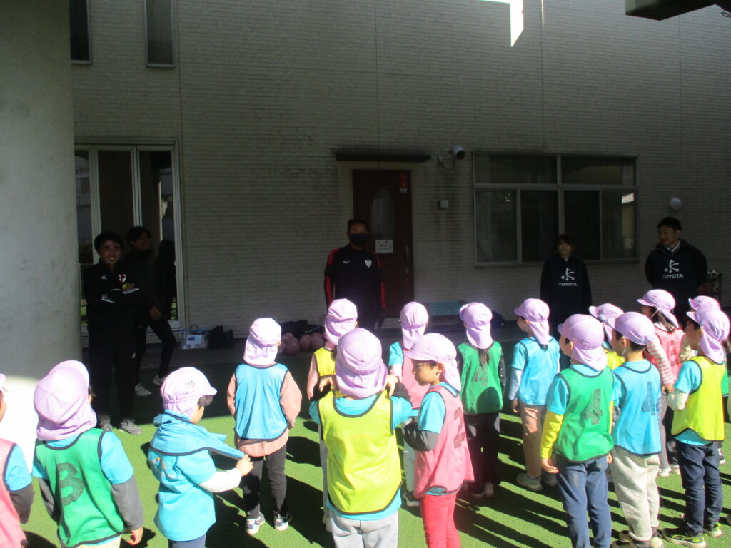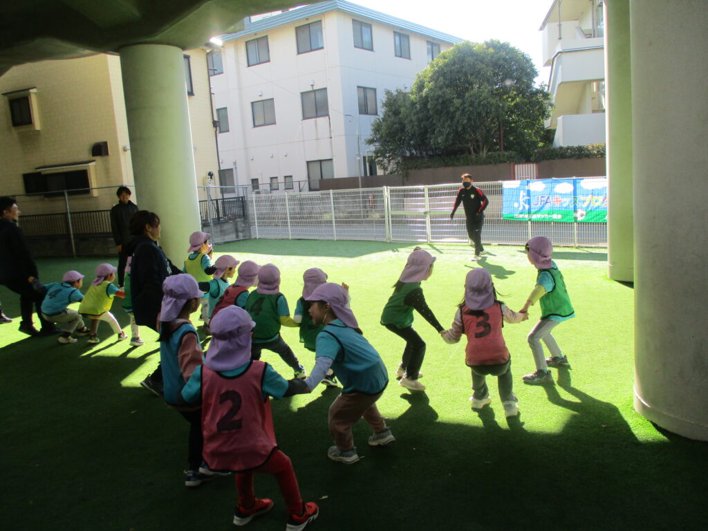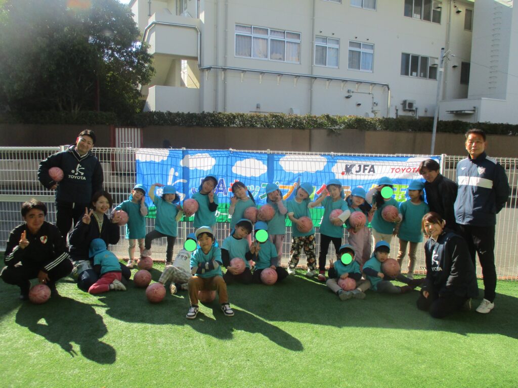 JFAサッカー教室 2026-01-26 保育園の園庭でJFAサッカー教室を行いました。講師の先生のお話を聞きながらみんなで楽しく身体を動かしました。 らいおん組さんは最後にビブスの色に分かれてミニゲームをしました♪どのチームも白熱した試合で最後まで目が離せませんでした! 次回の投稿もお楽しみに♪