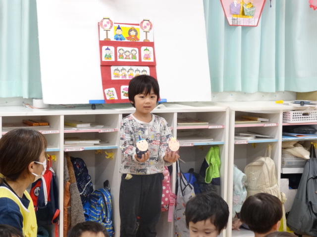 ひな祭りにちなんだ制作発表やパネルシアターを見たり、クイズに参加しました。