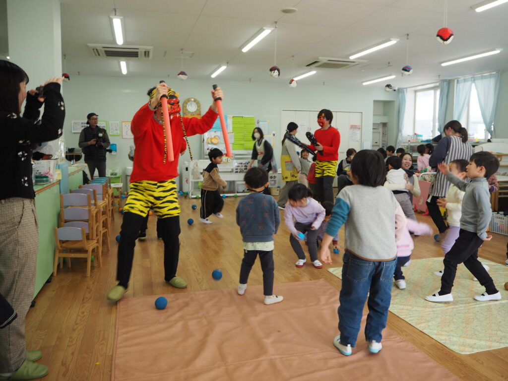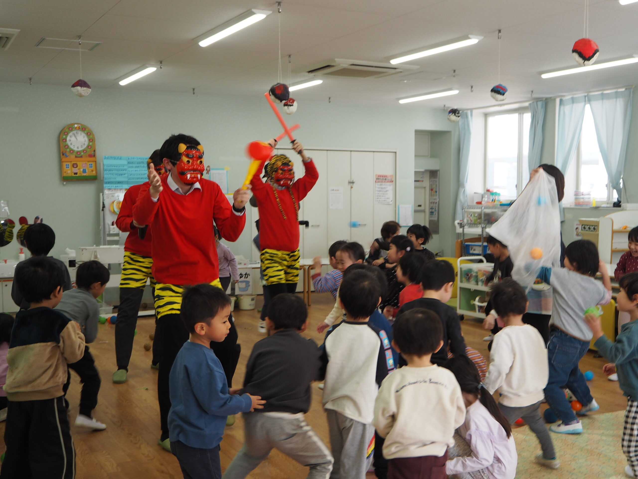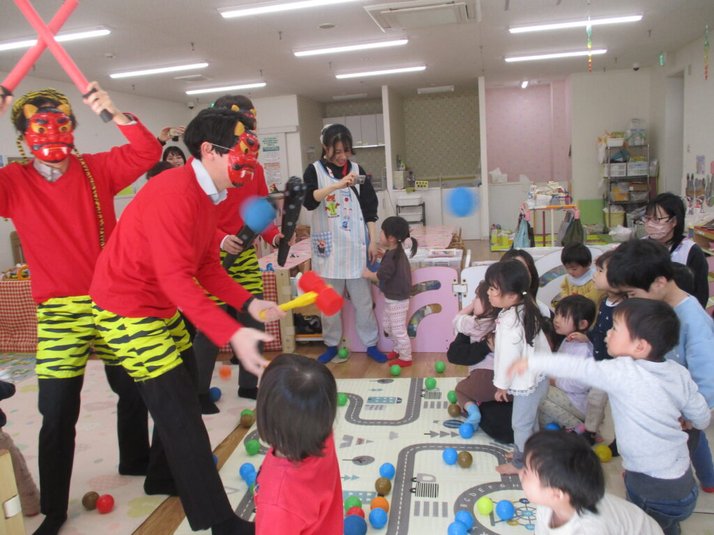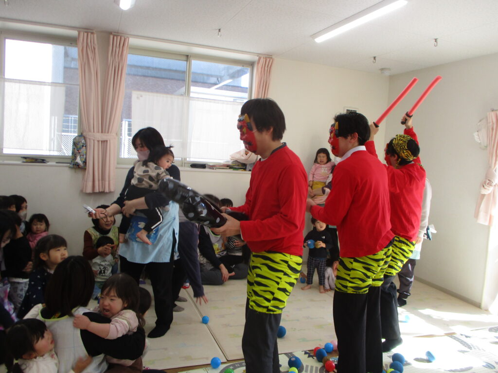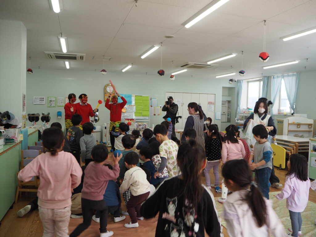 節分集会 2026-03-26 2月3日に節分集会を行いました。 「どうして豆を投げるんだろう?」「節分の日は何を食べるのかな?」とクイズを楽しみながらお話をしました。 節分のお話をしていると鬼が登場し、大絶叫でした。 「鬼は外、福は内」と今まで練習していたセリフを何度も言いながら ボールで鬼退治を頑張りました。 OLYMPUS DIGITAL CAMERA 最後は優しい鬼が降参し、優しい鬼に変わりました。 また来年も、鬼が来るかもしれませんね。