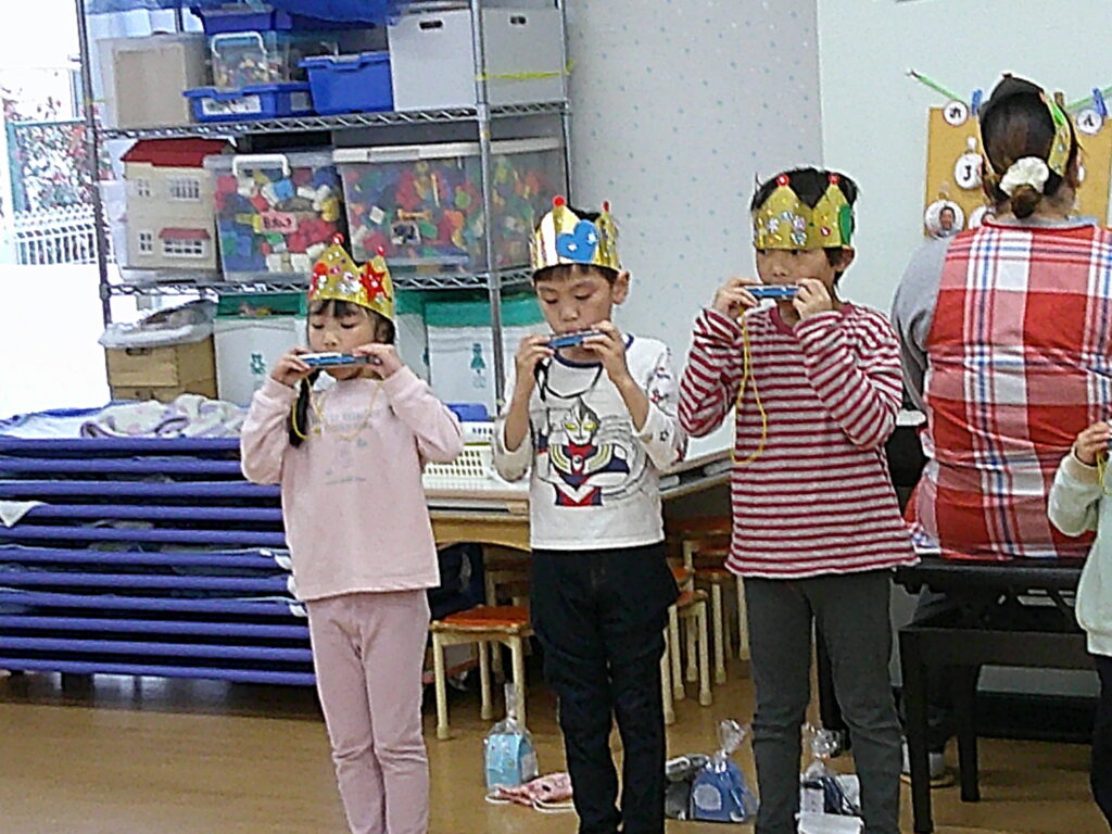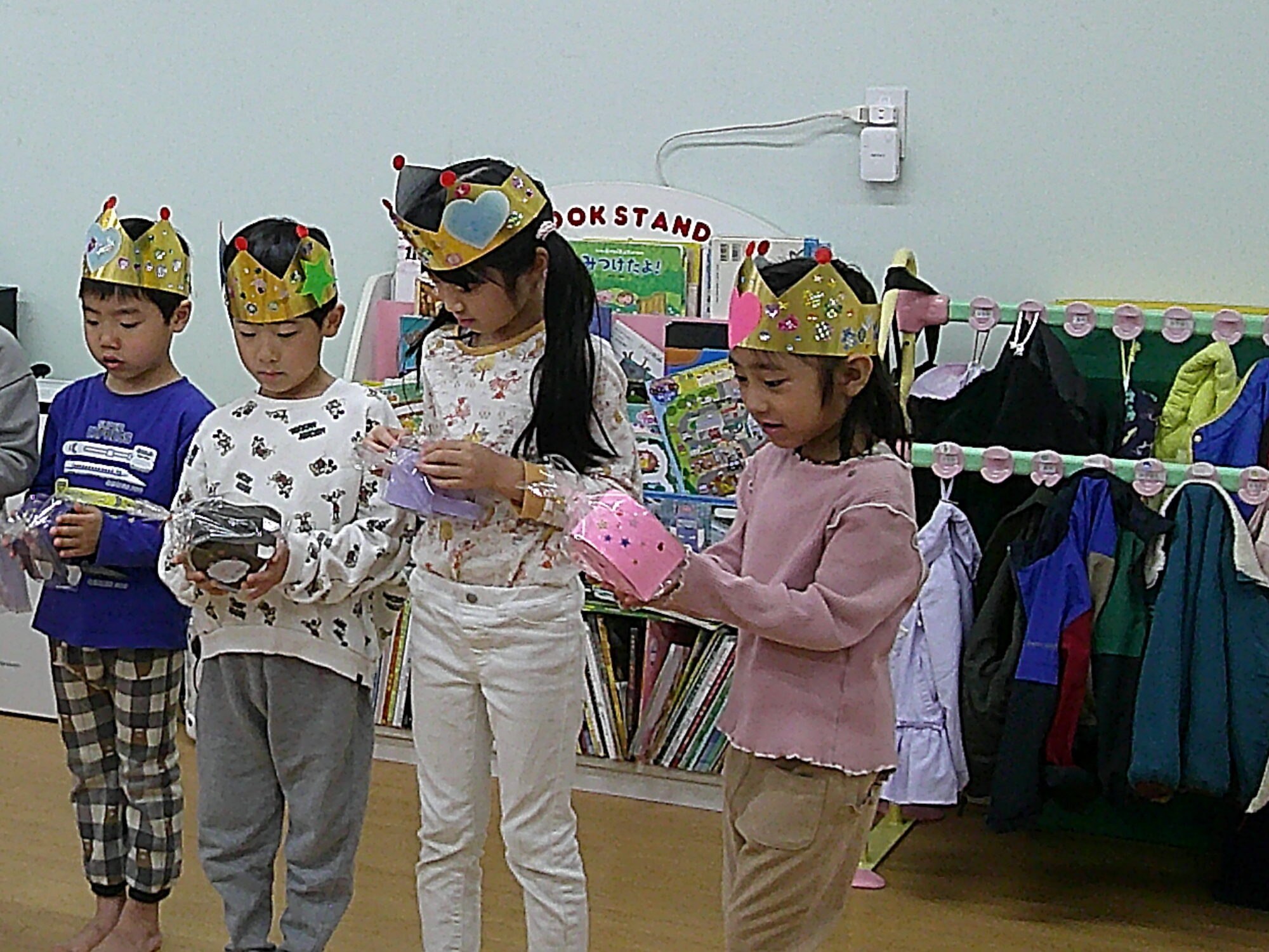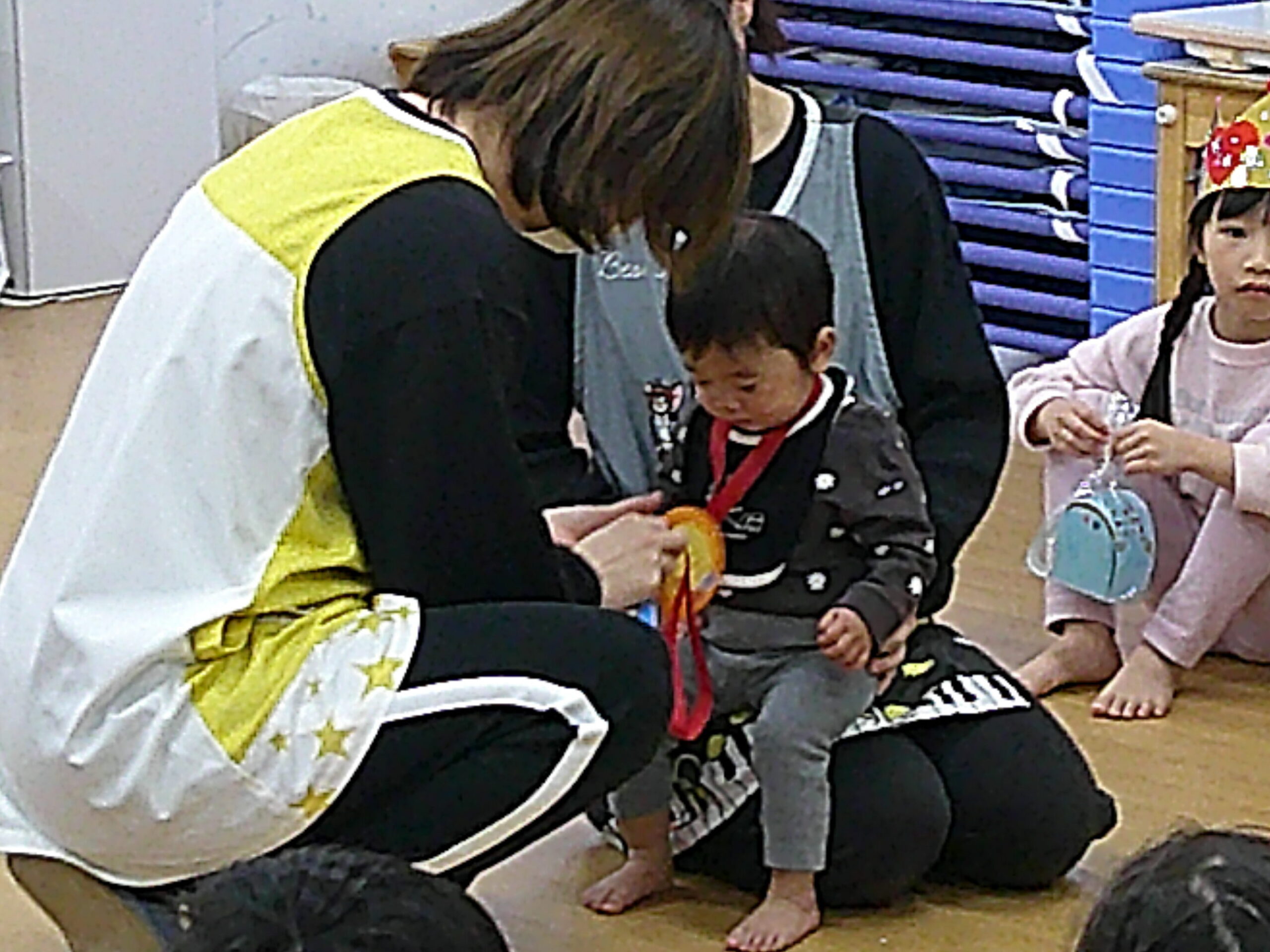 お別れ会 2026-03-31 お別れ会がありました。在園児から卒園児に「今までの感謝と小学校に行っても頑張ってね。」とメッセージを込めて0.1.2歳児からは王冠と3.4歳児からはランドセルの入れ物のプレゼントを贈りました。 Digital Camera 最後に卒園児からハーモニカ演奏のプレゼントがありました。みんなの前で堂々と演奏出来ていてかっこよかったです。聞いていた友だちも知っている歌が流れると体を揺らして楽しんでいました。 Digital Camera 退園児には担任からメダルのプレゼントを贈りました。「離れていてもずっと友だち」というメッセージが込められています。 Digital Camera