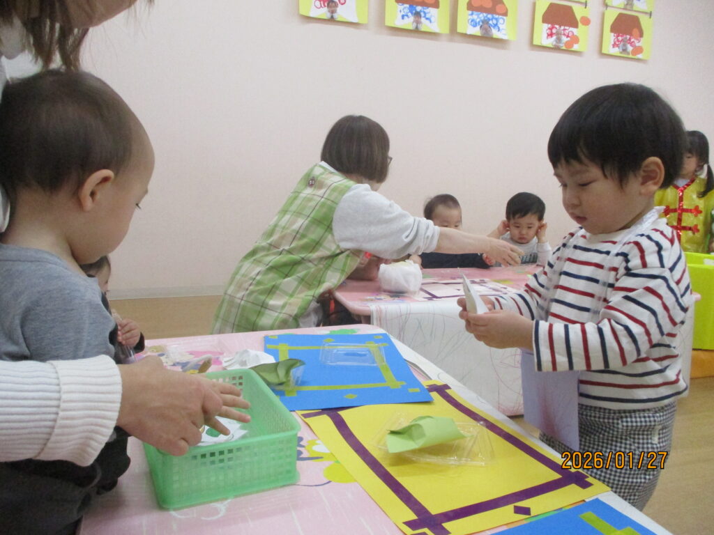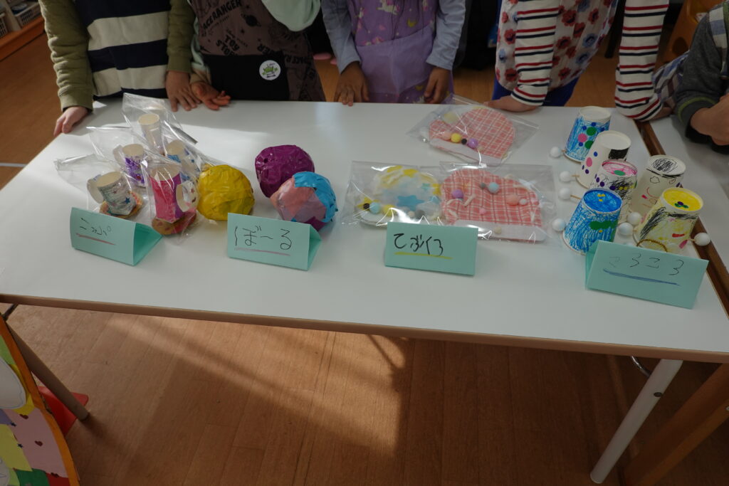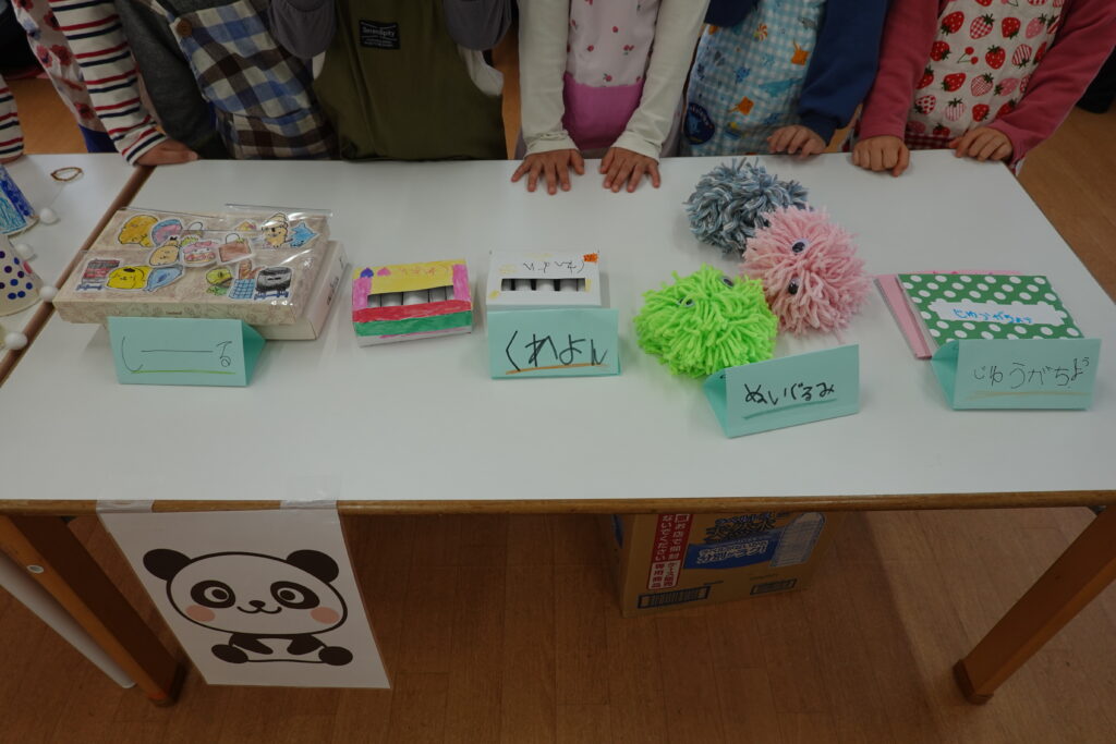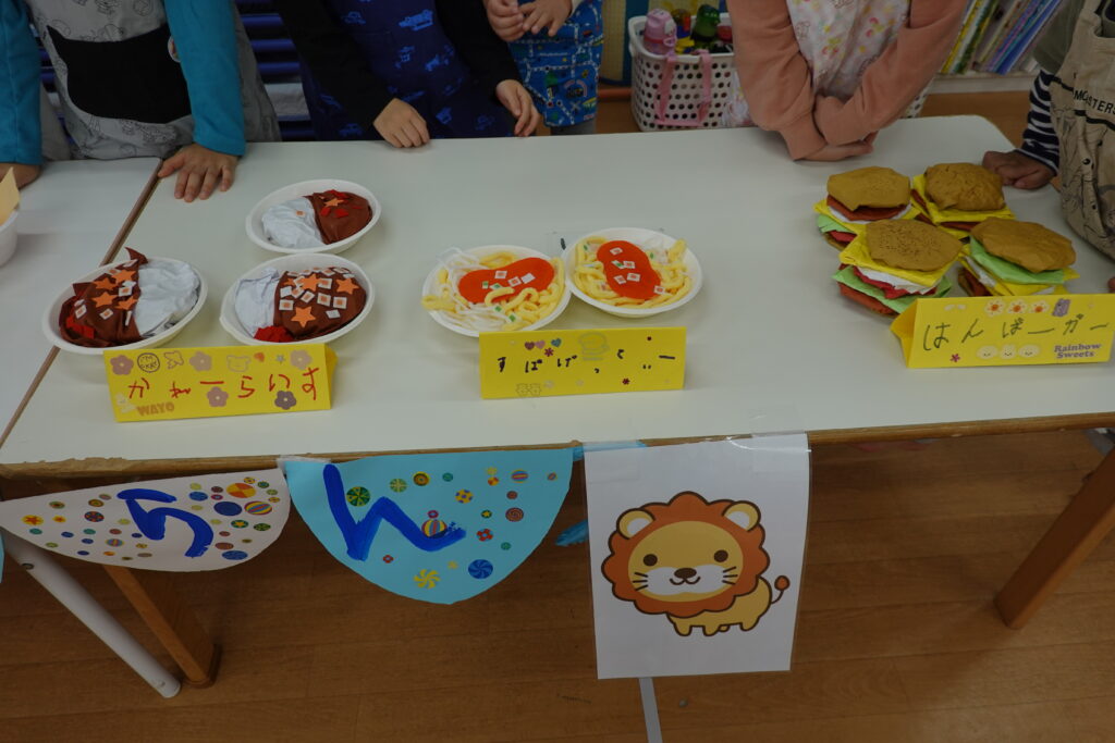 2歳児はおもちゃ屋さん。楽しそうなおもちゃが並びます。