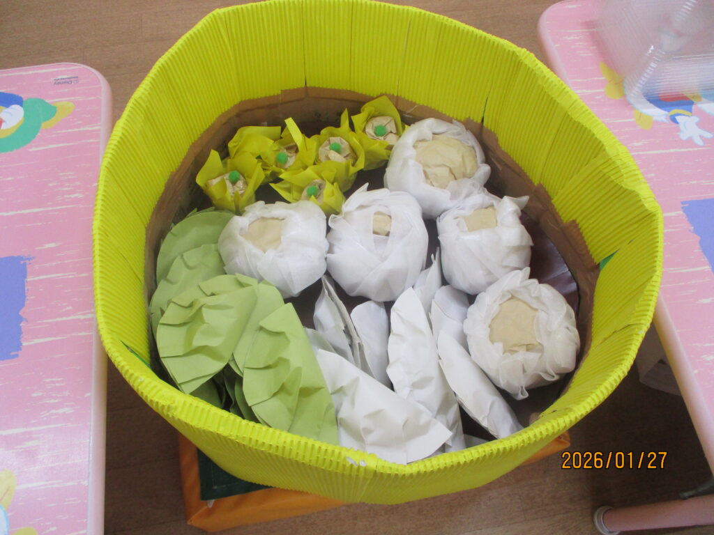 0、1歳児は中華屋さんです。肉まんや餃子等美味しそうな食べ物が並んでいます。