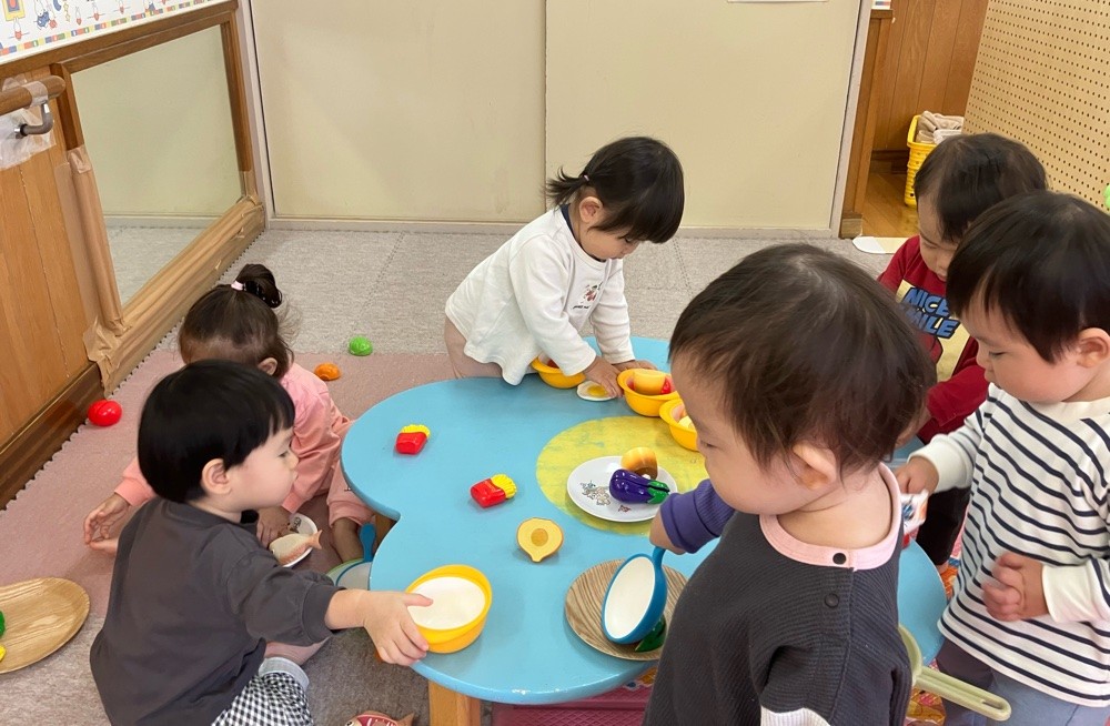 お料理楽しいな! 2025-10-29 お部屋でおままごとをしました。最近はご飯の時も少しずつスプーンやお皿を持ちながら上手に食べられる子も増えてきました。おままごとを見ると、食べる真似をしたり、お皿に食べ物を並べたり、保育者に食べさせてくれたりと、とても楽しそうに遊んでいました。楽しく食育に繋がるような遊びを取り入れていきたいと思います。
