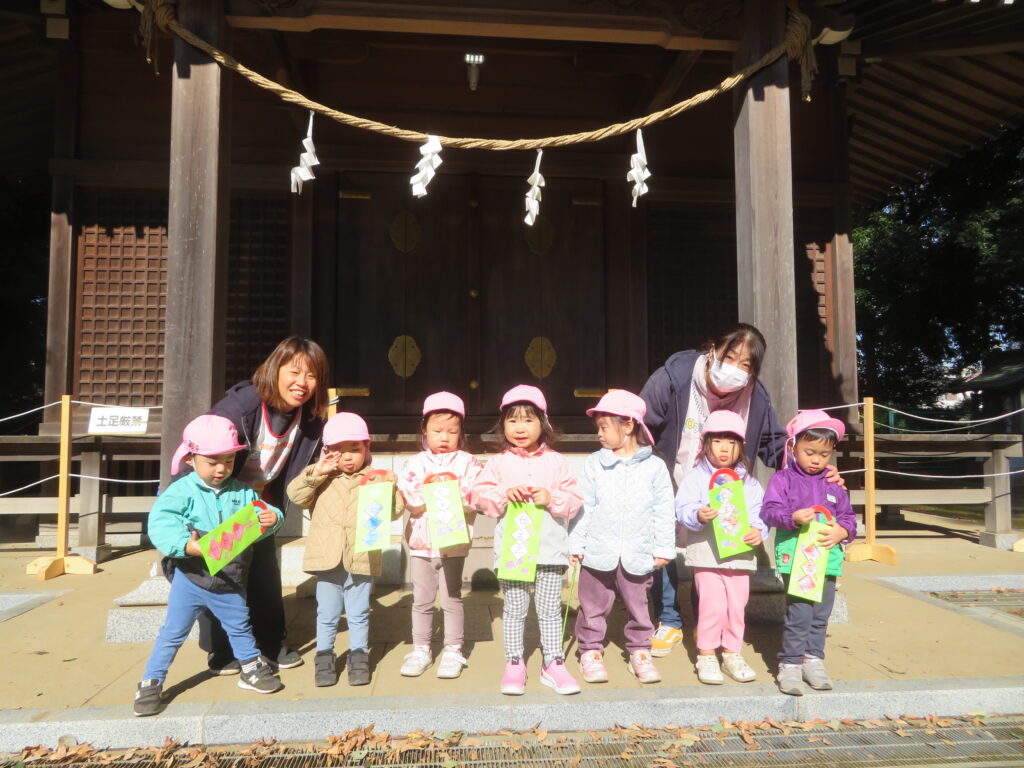 七五三のお参りに足立神社に行ってきました。ご家庭ですでにお参りに行った子も多く、「お願いしに行くの?」と尋ねる姿もありました。