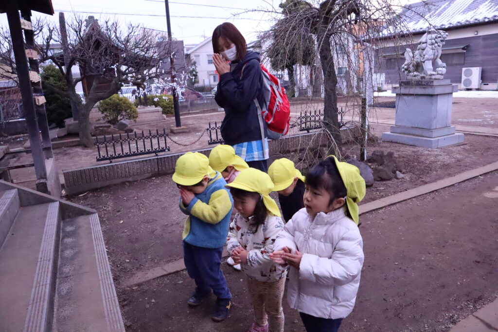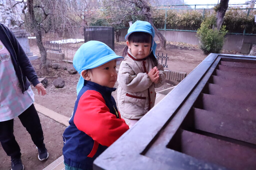 2歳児は保育士の真似して上手に二礼二拍手一礼が出来ました!
