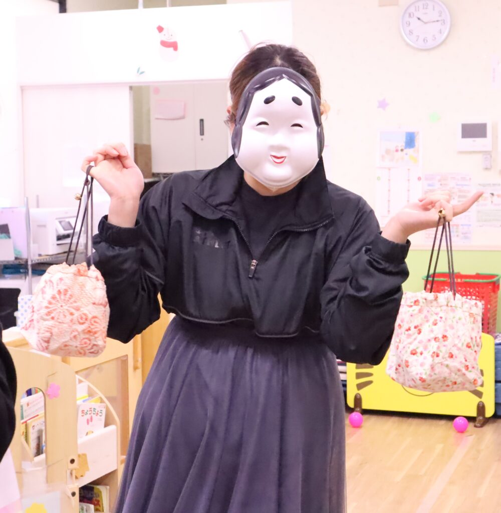 鬼を退治したら福の神が現れたよ。巾着袋には豆の代わりにボーロが入っているよ。
