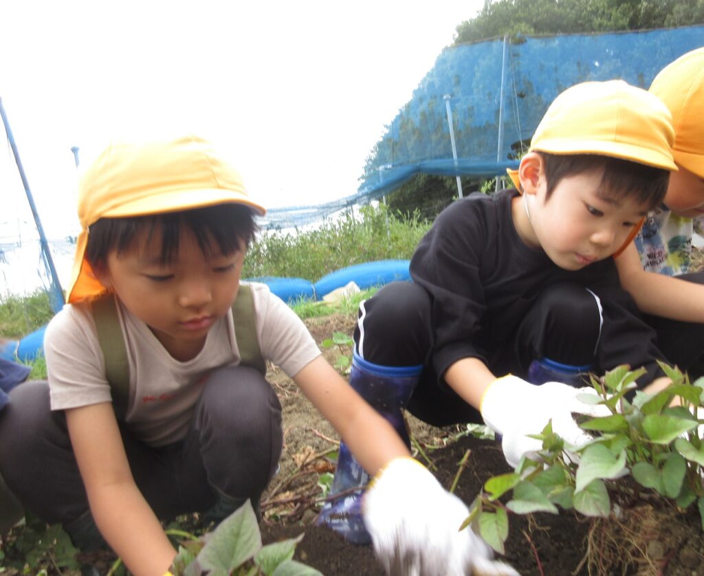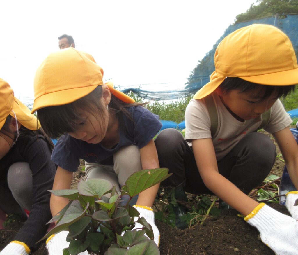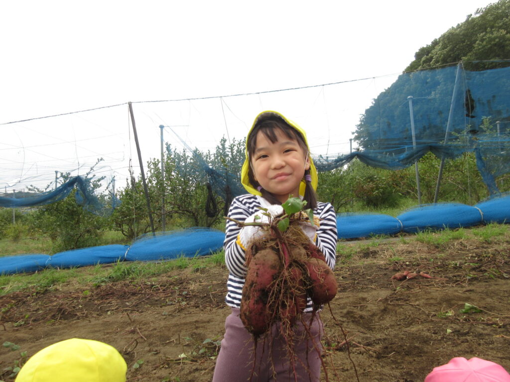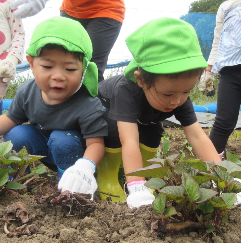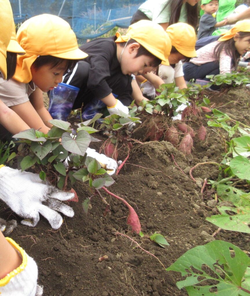 土の中から出てきた虫に驚いたり、畑の土の感触を楽しんだりしながら、お芋を掘りました。