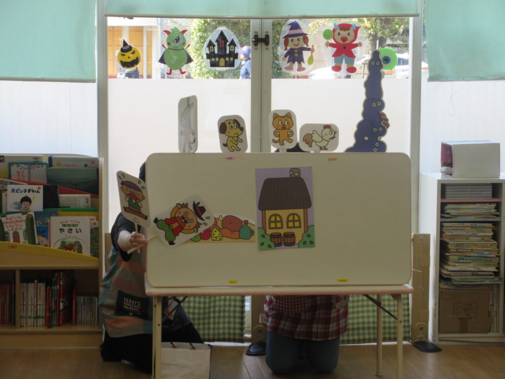 職員から出し物のプレゼント、今月はブレーメンの音楽隊のペープサートです。