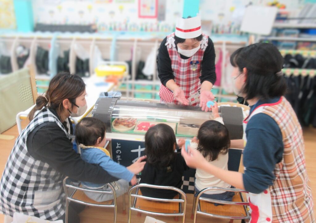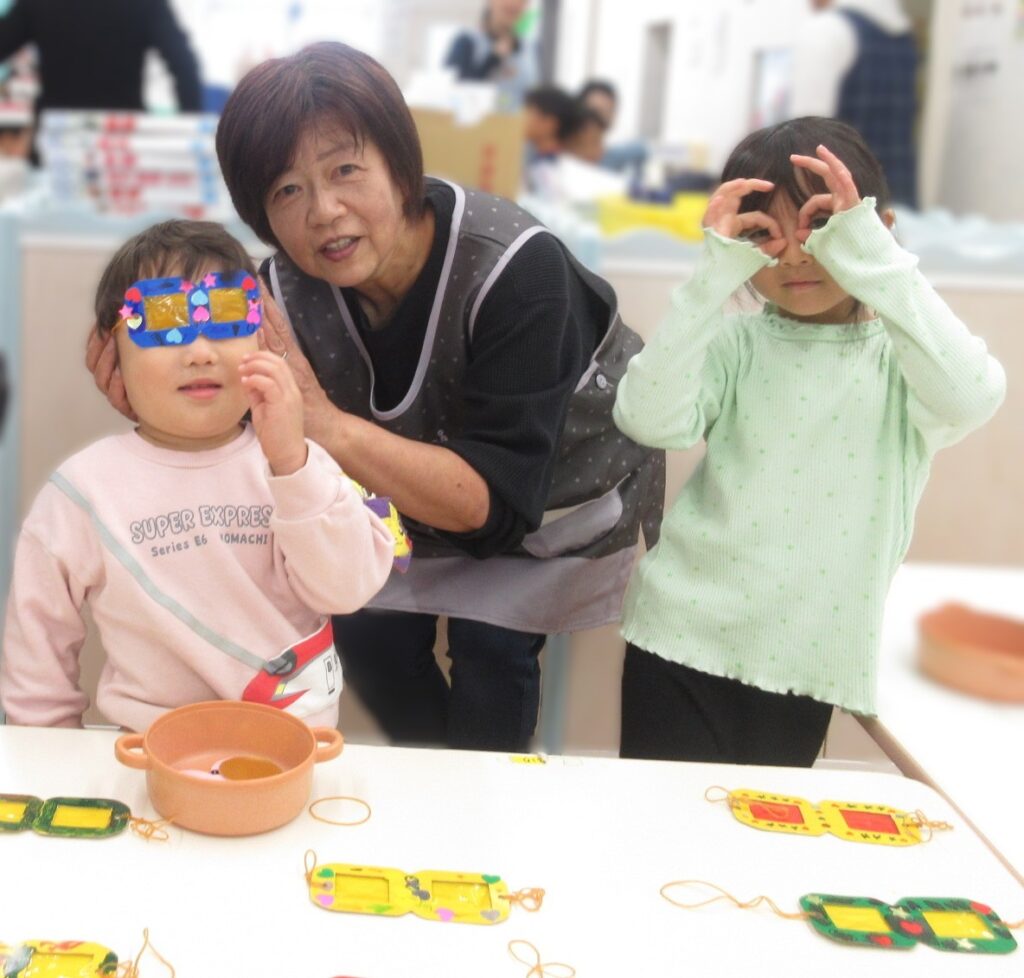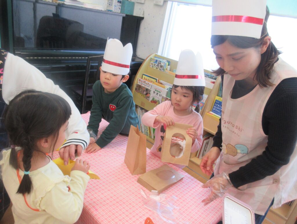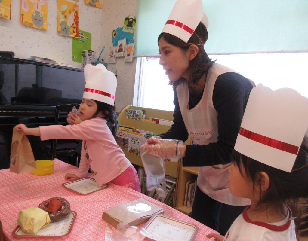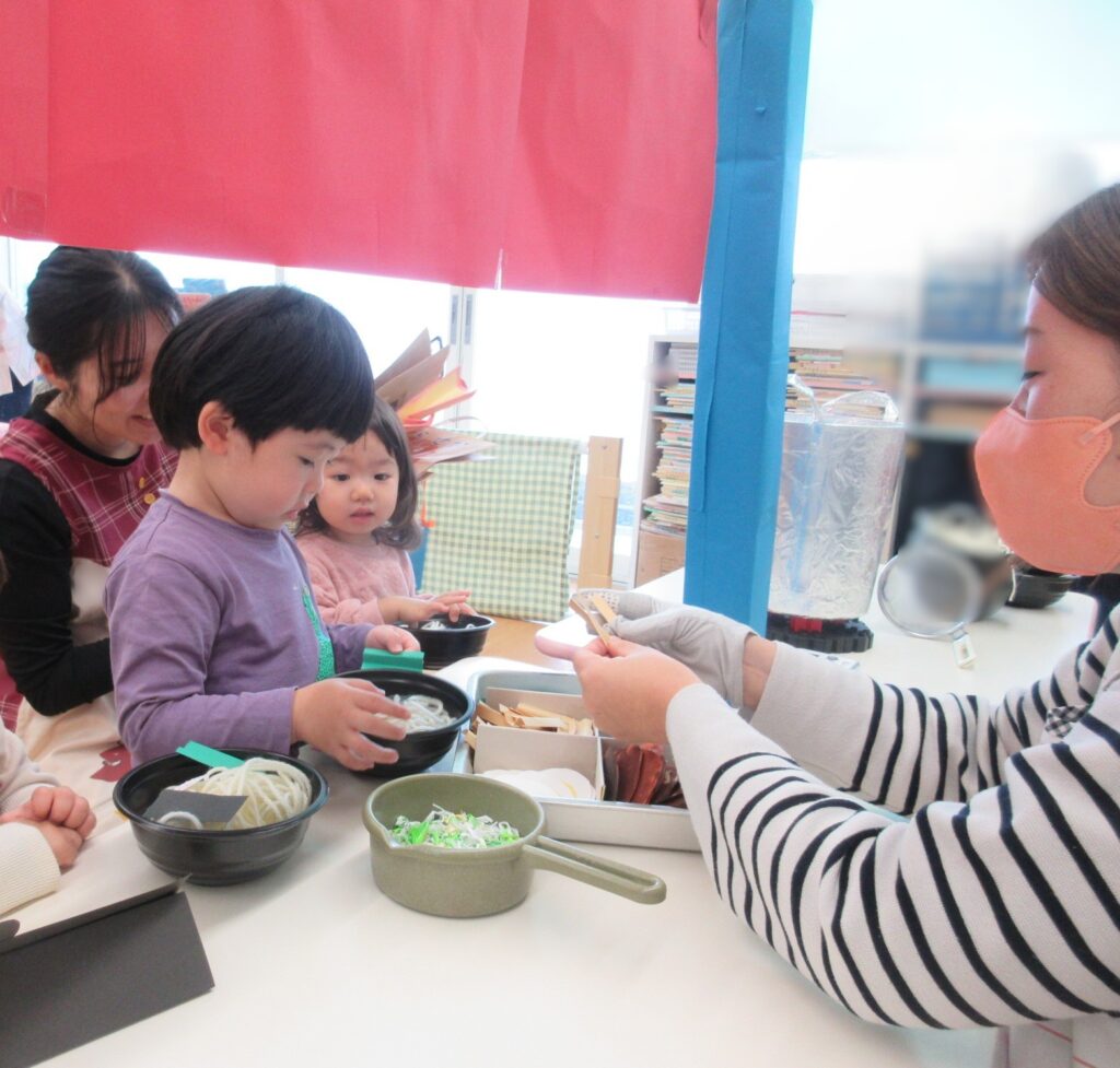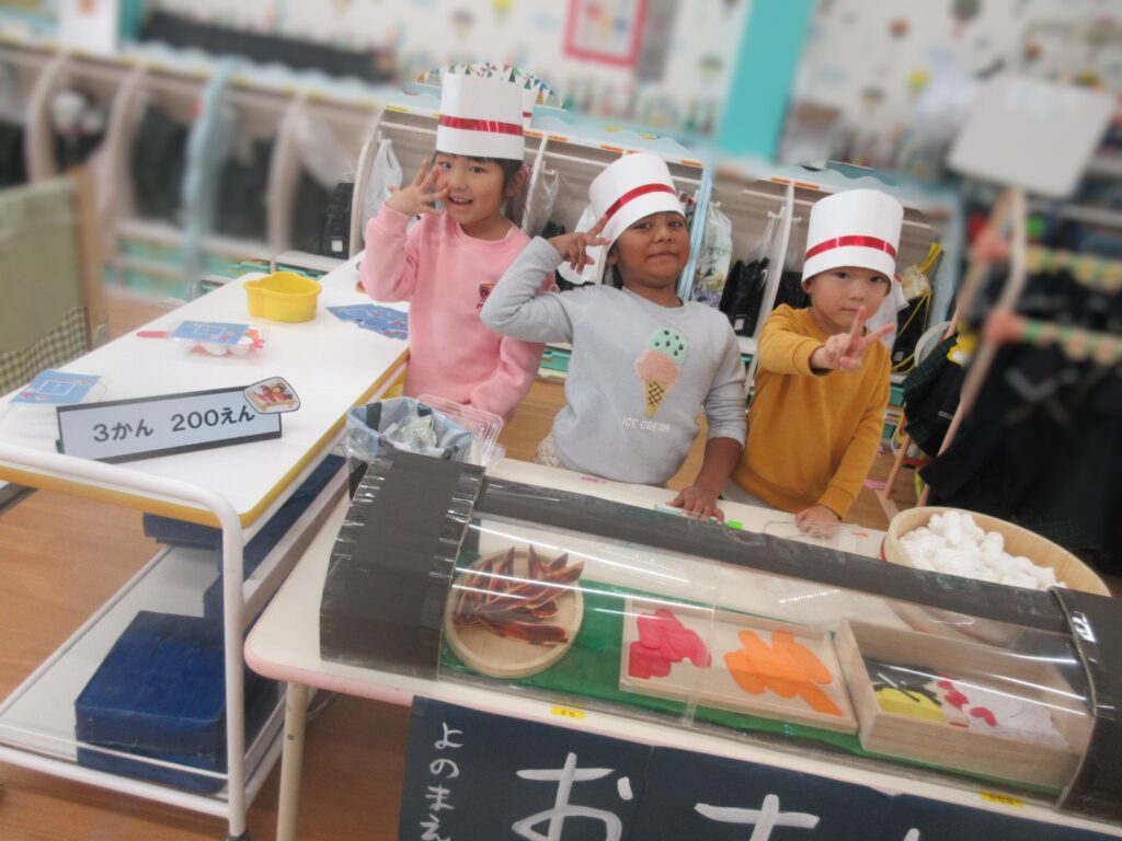 お店屋さんごっこは、沢山のお店が並びました。商品は全て、子どもたちの手作りです。