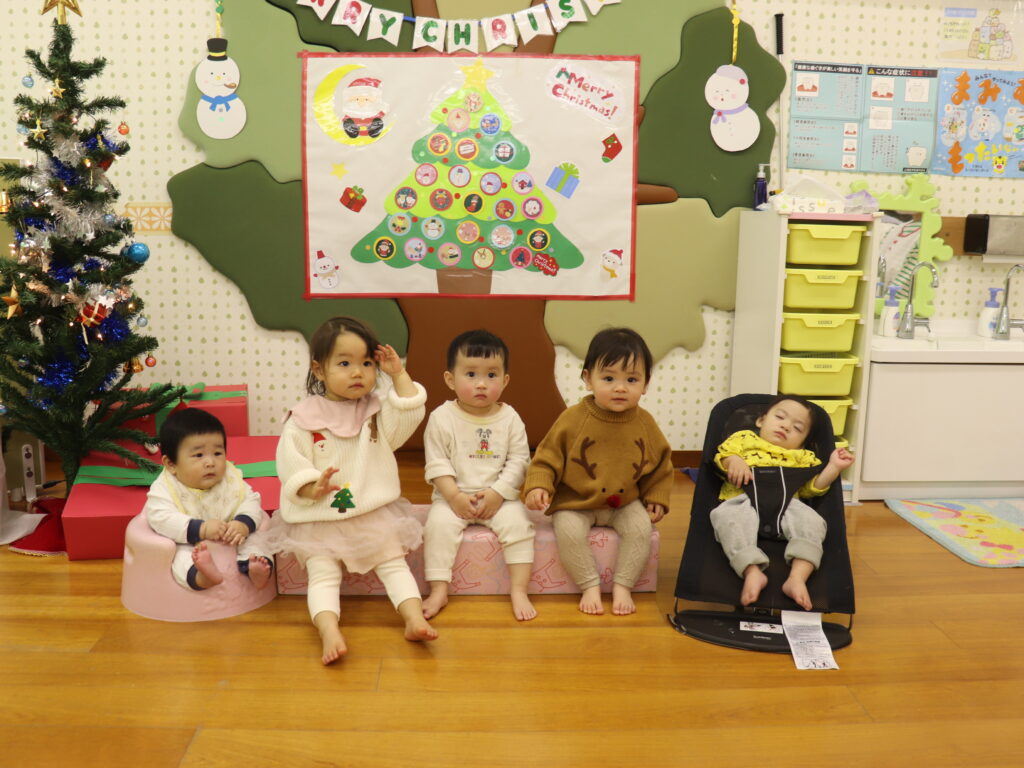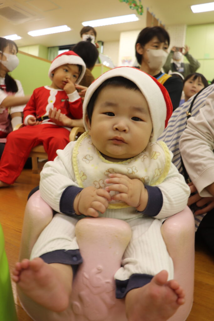 サンタさんの衣装が可愛い0歳児クラスのお友達。