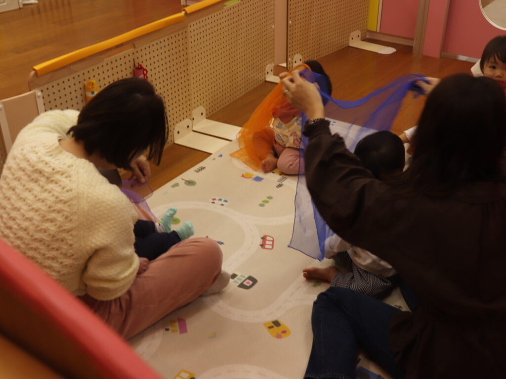 布を使い歌に合わせて体を動かしました。初めての環境に泣いてしまう子もいますが、ママと一緒に楽しむことができたようですよ。