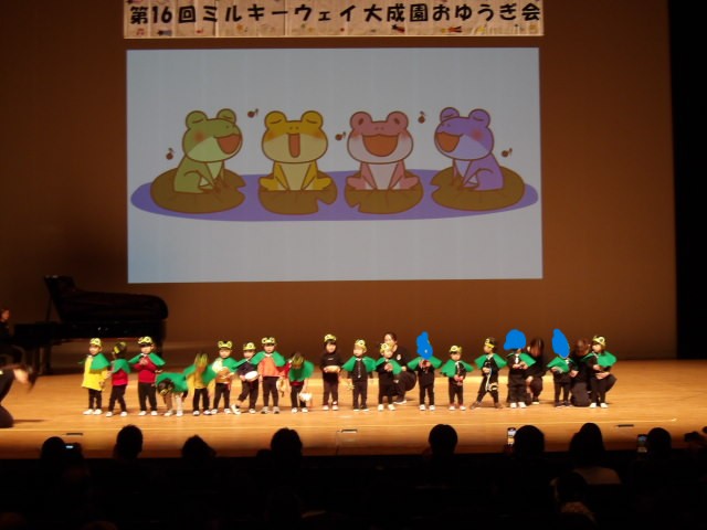 かえるっぽいの衣装を身に着けての「かえるのがっしょう」。カスタネットとタンバリンに挑戦しました。