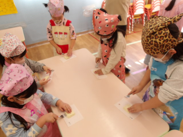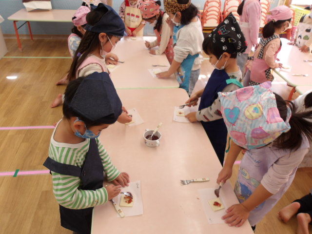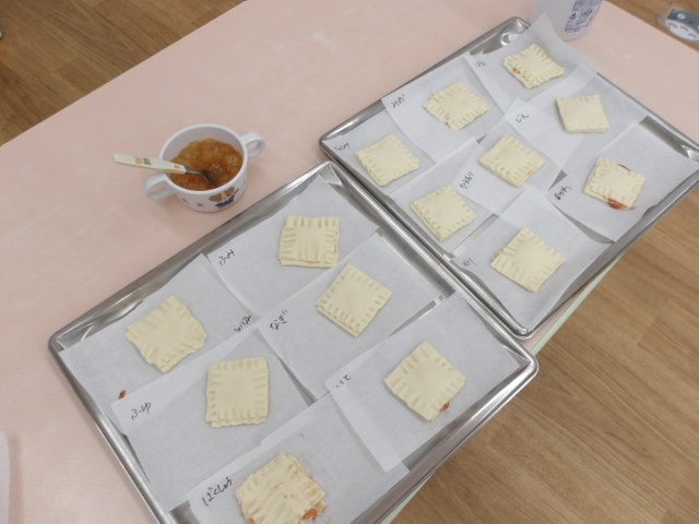 「パイの周りをフォークでギュギュっと押してね」の説明に「え~!フォークで!?」とビックリしていました。