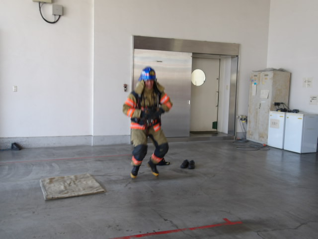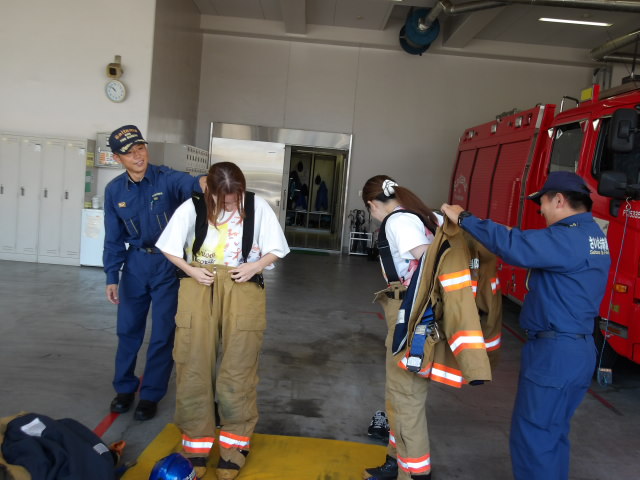 防火服に着替えるところも見せてもらいました。「すごい!」「かっこい~!」と子ども達も目をキラキラさせていました。