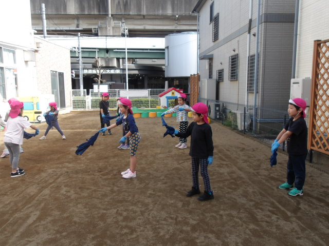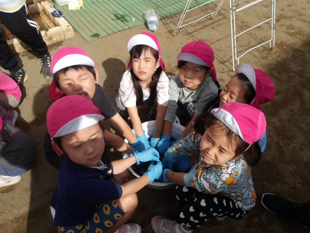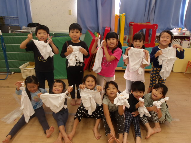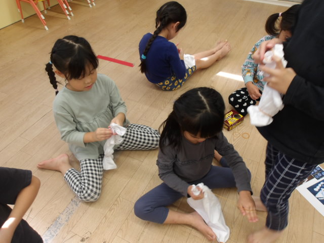 しぼるのに苦戦している子もいましたが「貸して!やってあげる!」と声をかけあいながら協力していました。