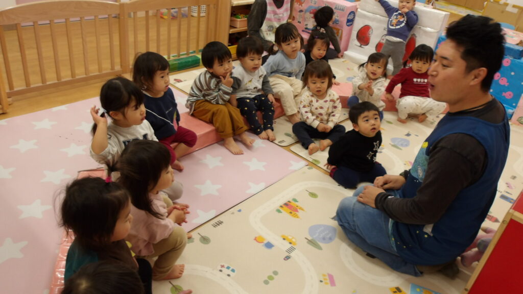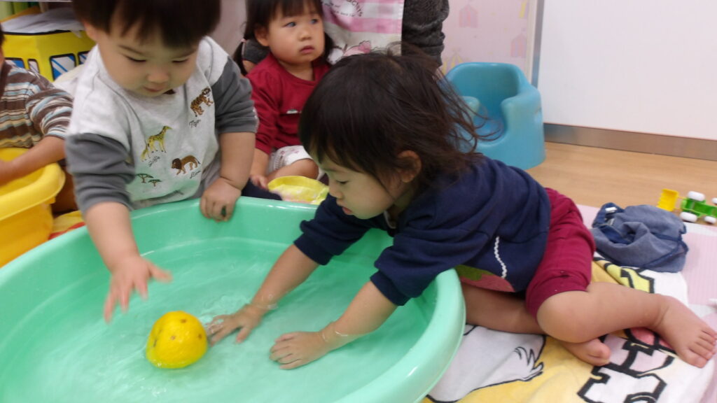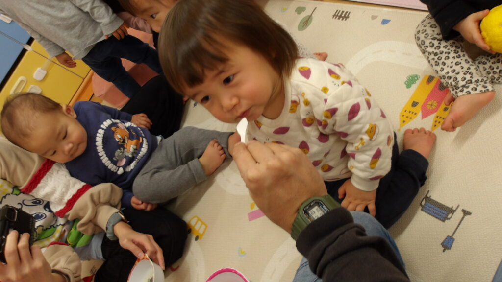 ゆず湯体験 2025-12-22 食育でゆず湯体験をしました。 まず初めに先生がゆず湯の絵本を読み、ゆず湯がどの様なものなのかを知りました。 絵本をみんなで見た後は、1人ずつ順番でゆずの汁を舐めてみて味覚体験をしました。 「すっぱい!」と感じて眉間にしわを寄せる子もいれば、逆に「おいしい!」と感じて喜ぶ子もいました。 味覚体験をした後はメインの「ゆず湯体験」!! 温かいお湯にプカプカと浮かぶゆずを見て、子どもたちも手を伸ばしていました。 お湯を手でチャプチャプとかき混ぜる子もいれば、ズボンを脱いでタライに入って、足湯の様にゆず湯を堪能する子もいました。 ゆず湯楽しかったね~♪