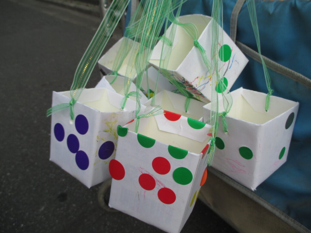 シールペタペタ楽しいなー。「これに何入れる?」「どんぐり」「葉っぱ」などなど想像力を働かせ期待いっぱいで作りました。