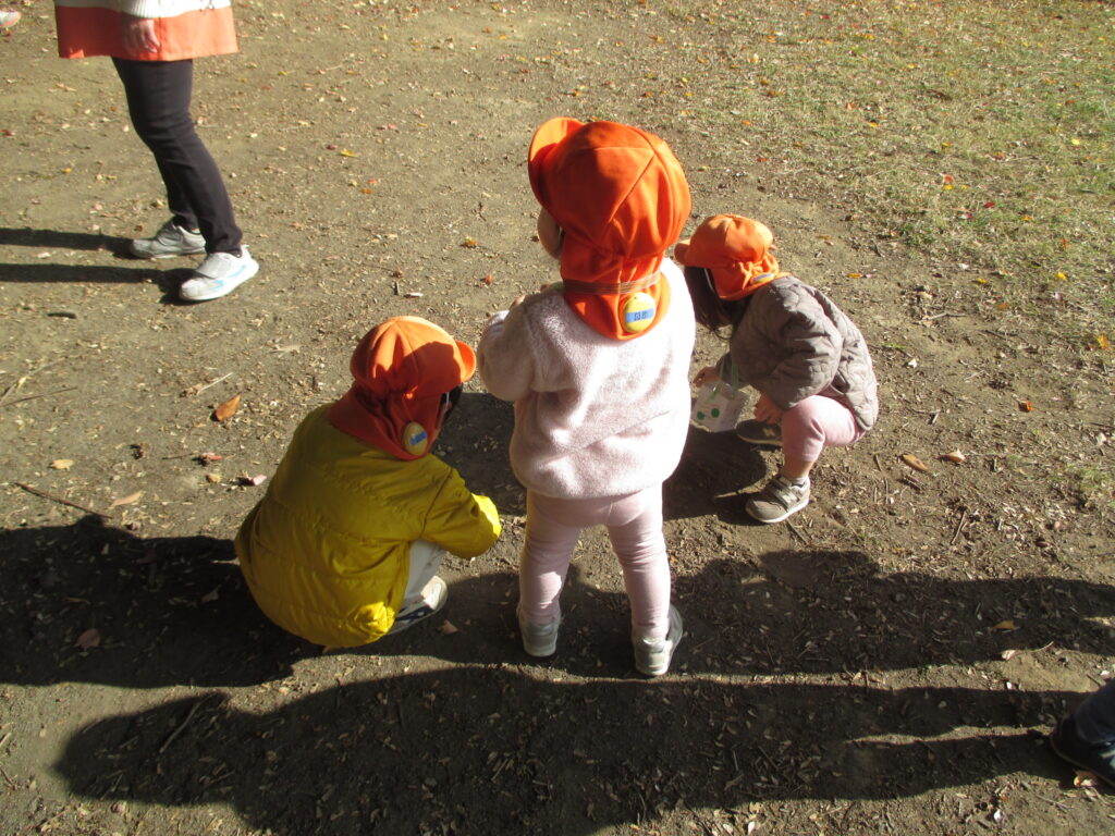 待ちに待った木場公園の日。手作りの入れ物に「ここにあった。」「あ、ここも」と、たくさんのどんぐりをいれて、大満足でした!