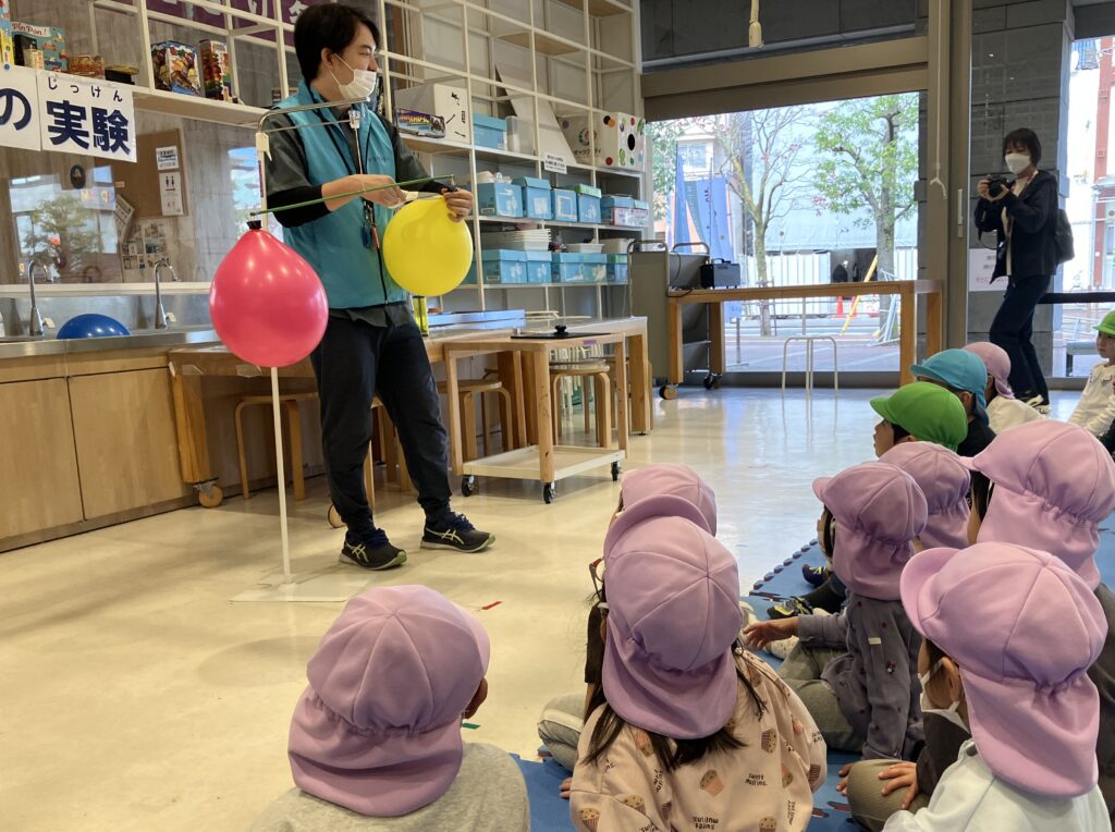まずは「空気の実験コーナー」みんな真剣に空気の不思議を聞いた後は、空気砲を浴びて大はしゃぎでした。