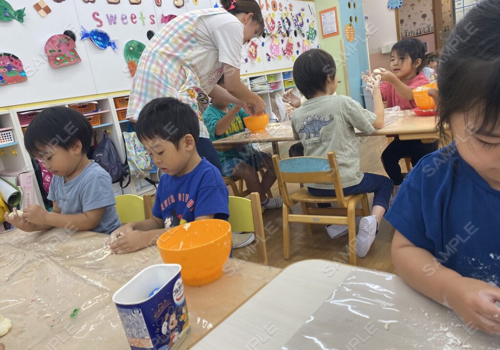 小麦ねんどで柔らかい感触を楽しんだり、画用紙で作ったピザでピザ屋さんごっこをしています