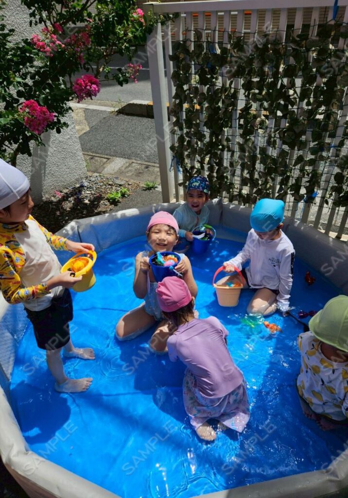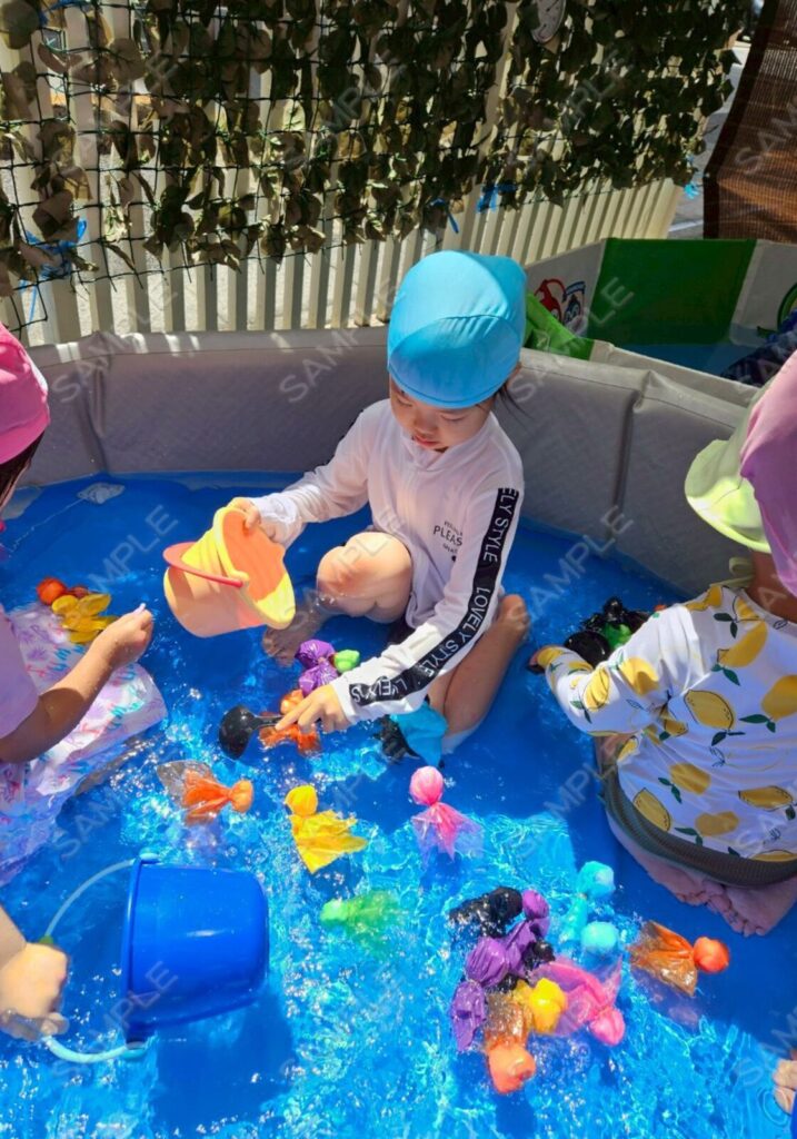 プール遊びでは幼児組が自分たちで作った金魚を水に浮かべて金魚すくいのように楽しんでいました🐟
