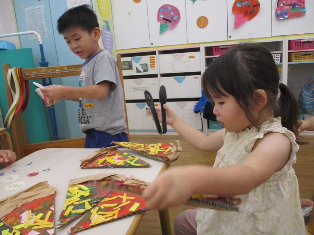 小さなシールも自分たちで台紙から剥がして貼れるようになりました