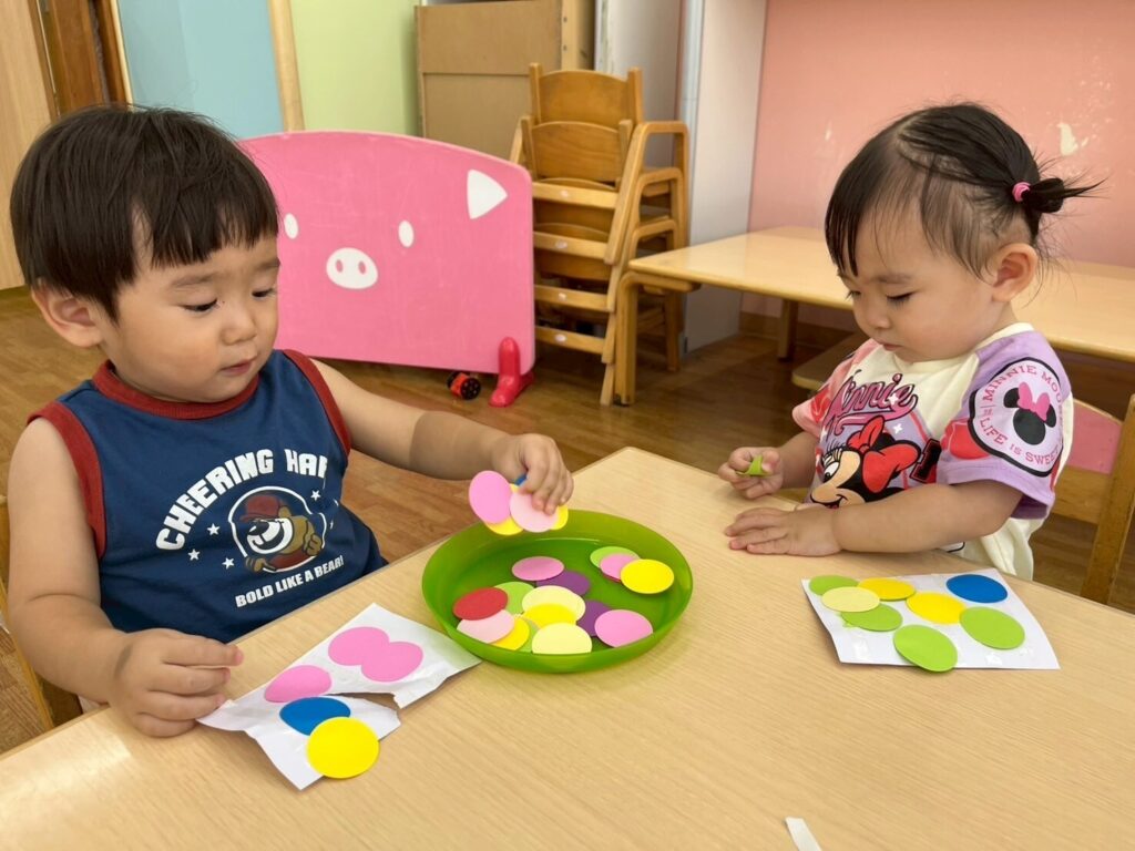 画用紙の小さな丸の中に上手に貼ることもできて、細かい作業がどんどん上手になっています!