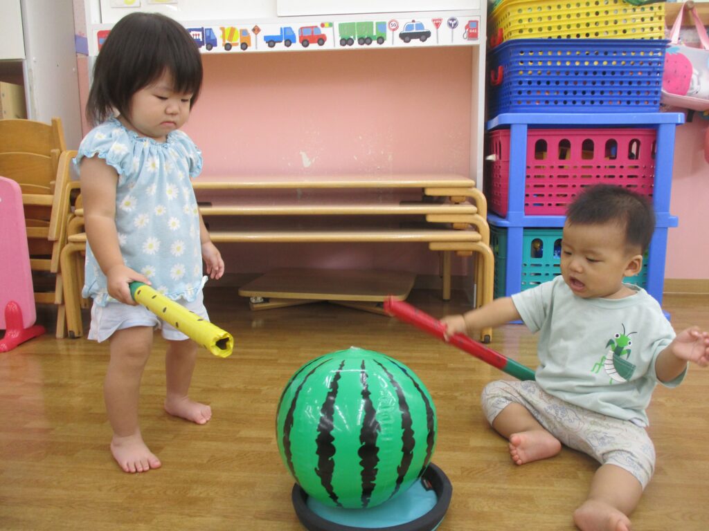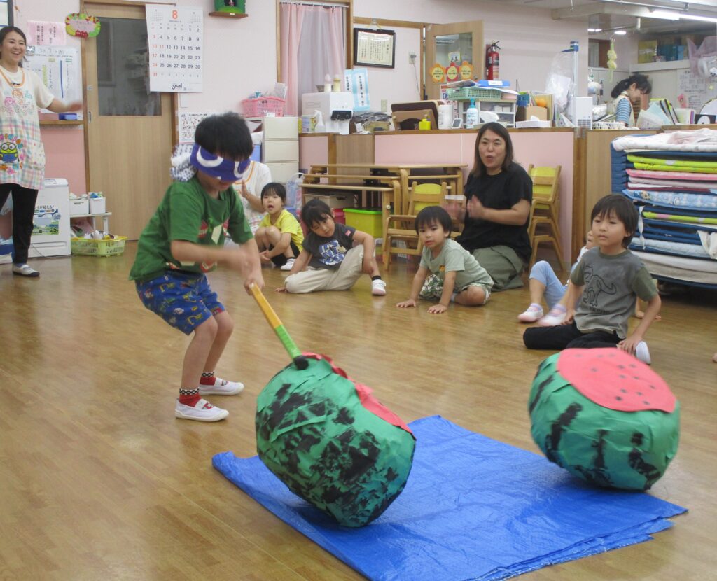 幼児組はお手製の特大すいかを、乳児組はすいかのボールですいか割りを体験しました!