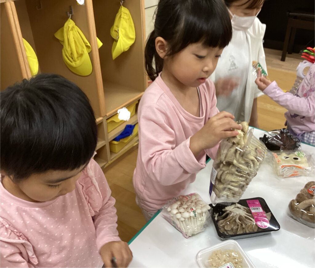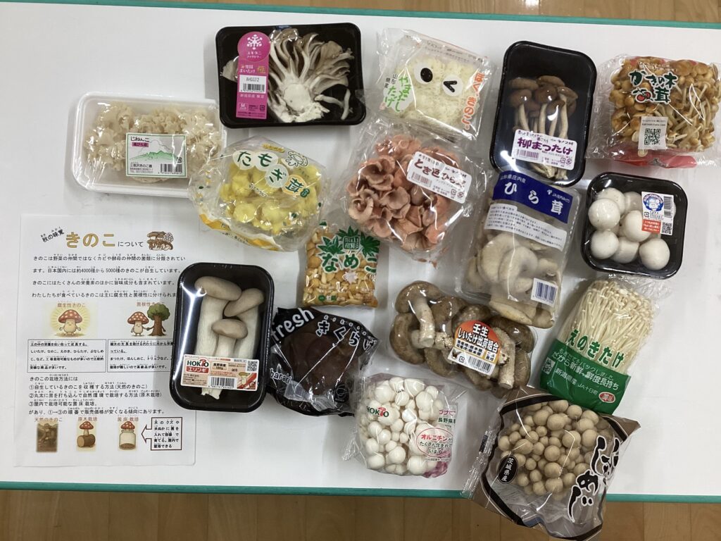 きのこの食育 2025-11-06 八百屋さんからたくさんのキノコを頂きました! 幼児組の子にはどんなキノコがあるのか、キノコはどうやって育つのかなど・・・栄養士さんからお話ししてもらいました。 「このキノコ知ってる!」「美味しそう~♥」と言いながら、順番にキノコに触れたり、においをかいでみたりと興味津々の子ども達でした。 玄関にも飾ると親子で見たり触れたり・・・きのこが大好きなんですと持って帰ろうとしてしまう子がいたりと秋の味覚に触れるいい機会になりました☆