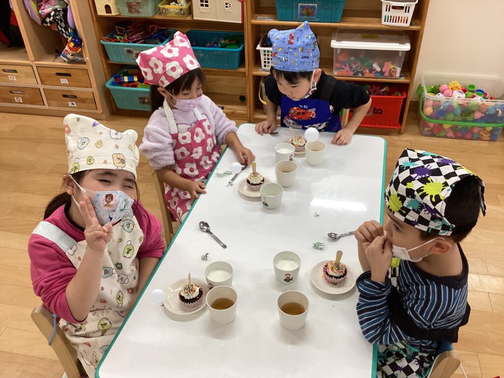 おやつは可愛らしいケーキを頬張っていました♪幼児組は自分たちでデコレーションしていましたよ☆