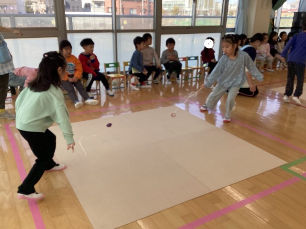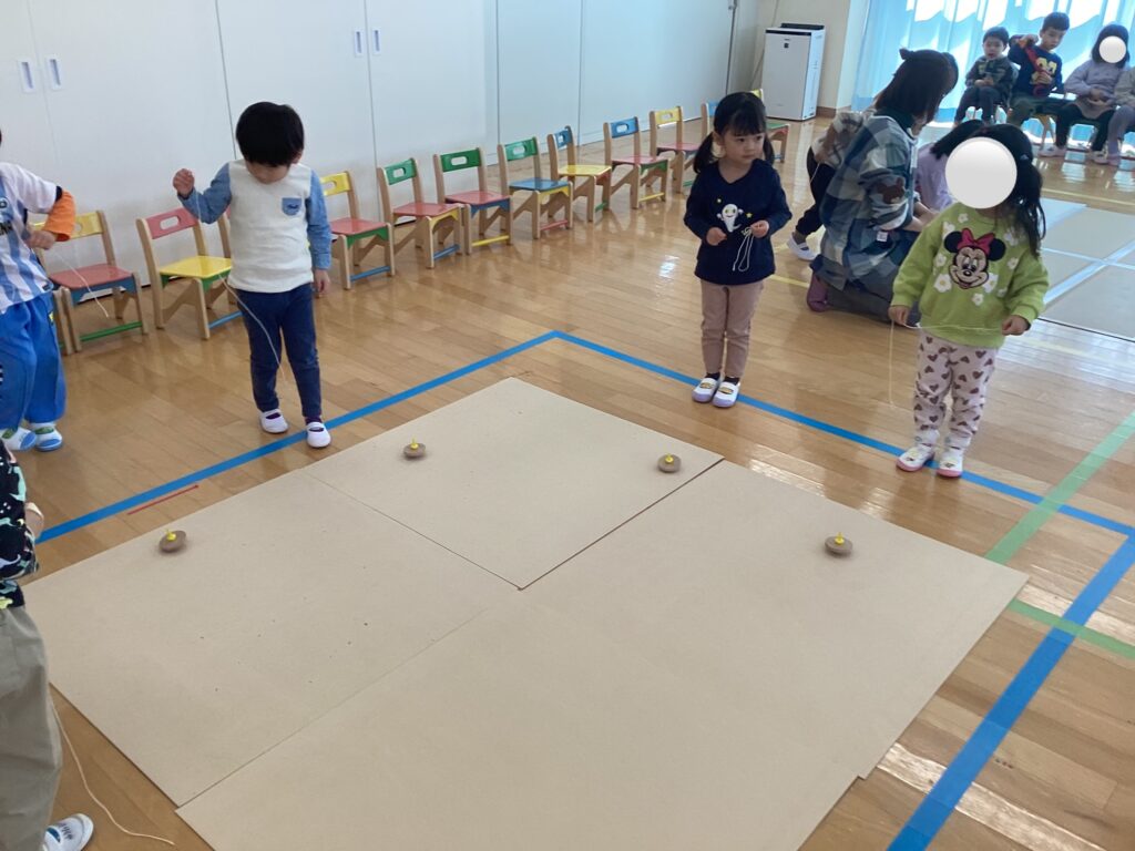 コマ回し大会 2026-02-02 1月30日は幼児組さんの第3回コマ回し大会でした。 年明けからお正月月間で毎日練習していた子ども達! 朝も気合十分でみんな練習に励んでいました☆ たんぽぽ組さん(3歳児)の部、すみれ組(4歳児)の部、ゆり組さん(5歳児)の部と順番に行っていき、今回は今までのコマ回し大会より白熱した戦いになりました! たんぽぽ組さんとすみれ組さんは引きゴマで対戦☆ ゆり組さんは投げゴマに挑戦☆