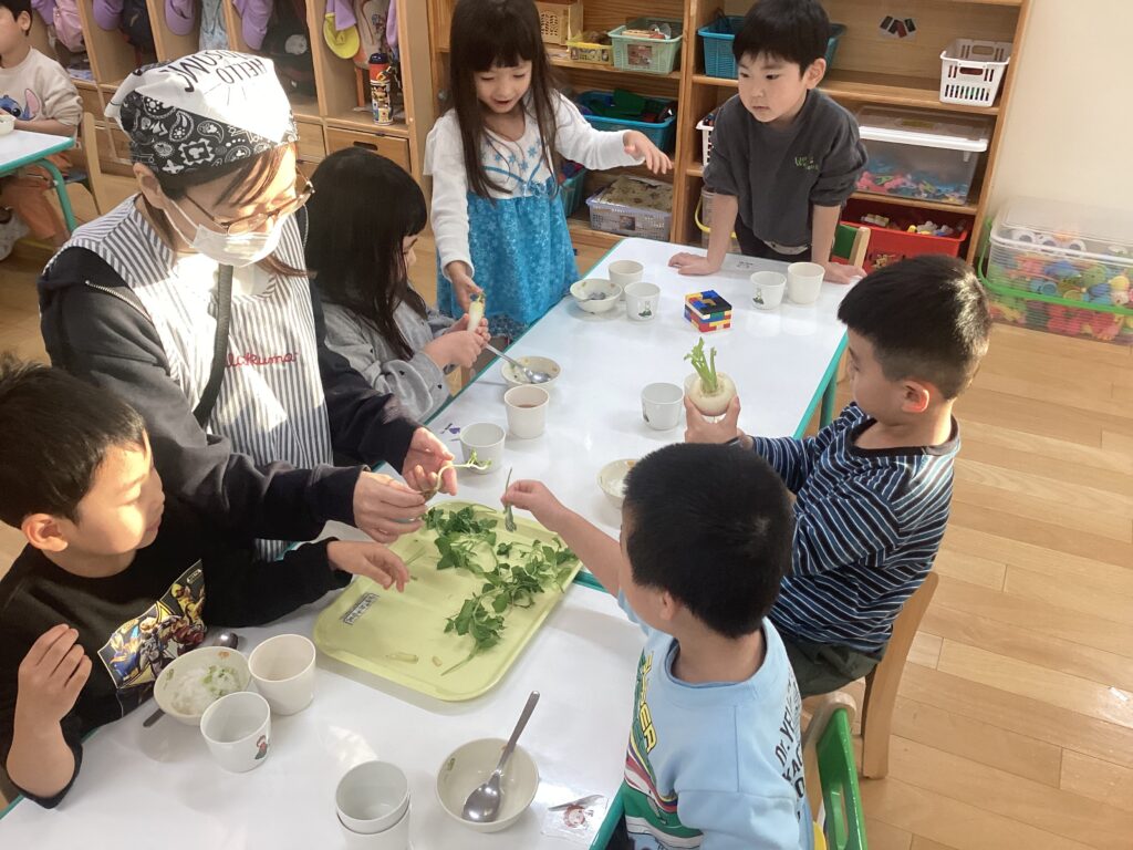 お野菜がたっぷりのお粥でしたが、食べてみるとおいしかったようで、完食してくれる子が多かったです。