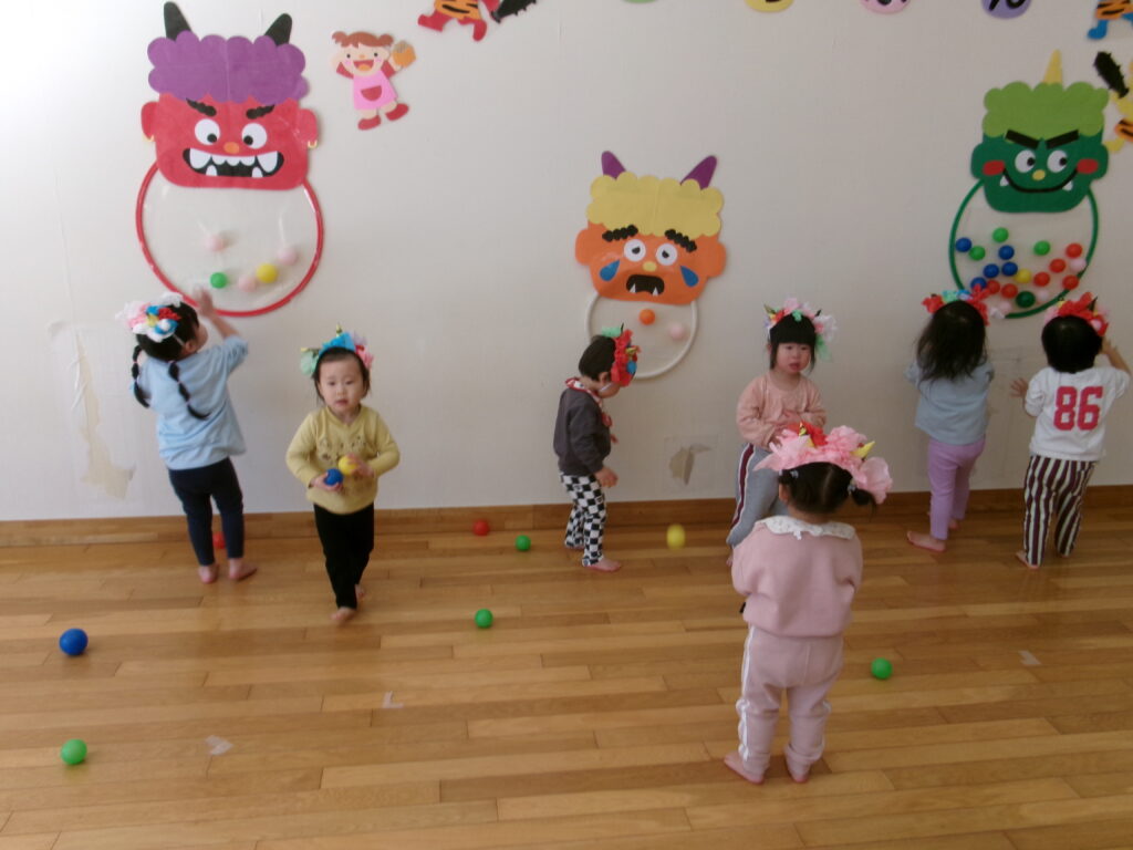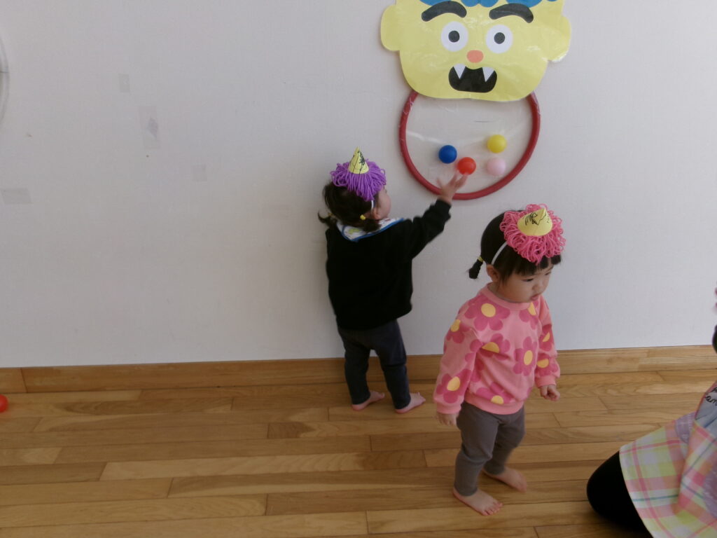 0歳児クラスさくらんぼ組🍒、1歳児クラスいちご組🍓のお友だちは、ホールで豆まきのお歌を歌い、節分にちなんだゲームを楽しみました。鬼さんのお顔に、テープを貼ってボールをぺったんこ✋とても楽しそうにくっつけていました。ついたボールを剝がすのも楽しかったようです。