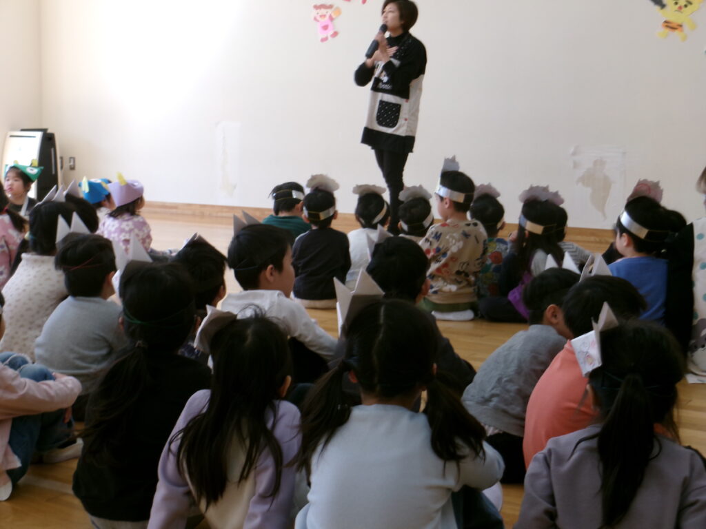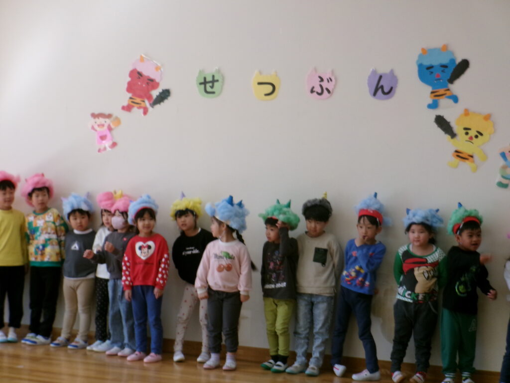 2歳児クラスみかん組🍊3歳児クラスれもん組🍋4歳児クラスぶどう組🍇5歳児クラスめろん組🍈の子どもたちもホールに集まって節分の由来のお話を聞いたり、歌をうたったりしました。