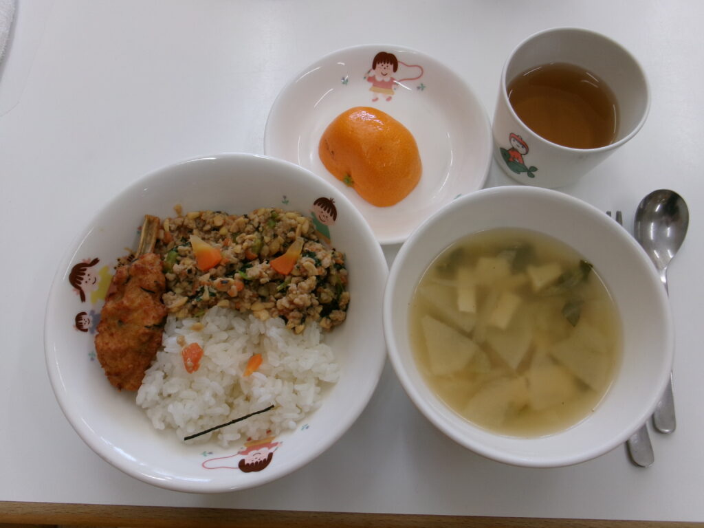 ごはんに、ニンジンでできた鬼の目と角、海苔できた口がついた鬼の納豆そぼろ丼・金棒に見立てた鬼の金棒つくね・カブの味噌汁・みかん🍊でした。