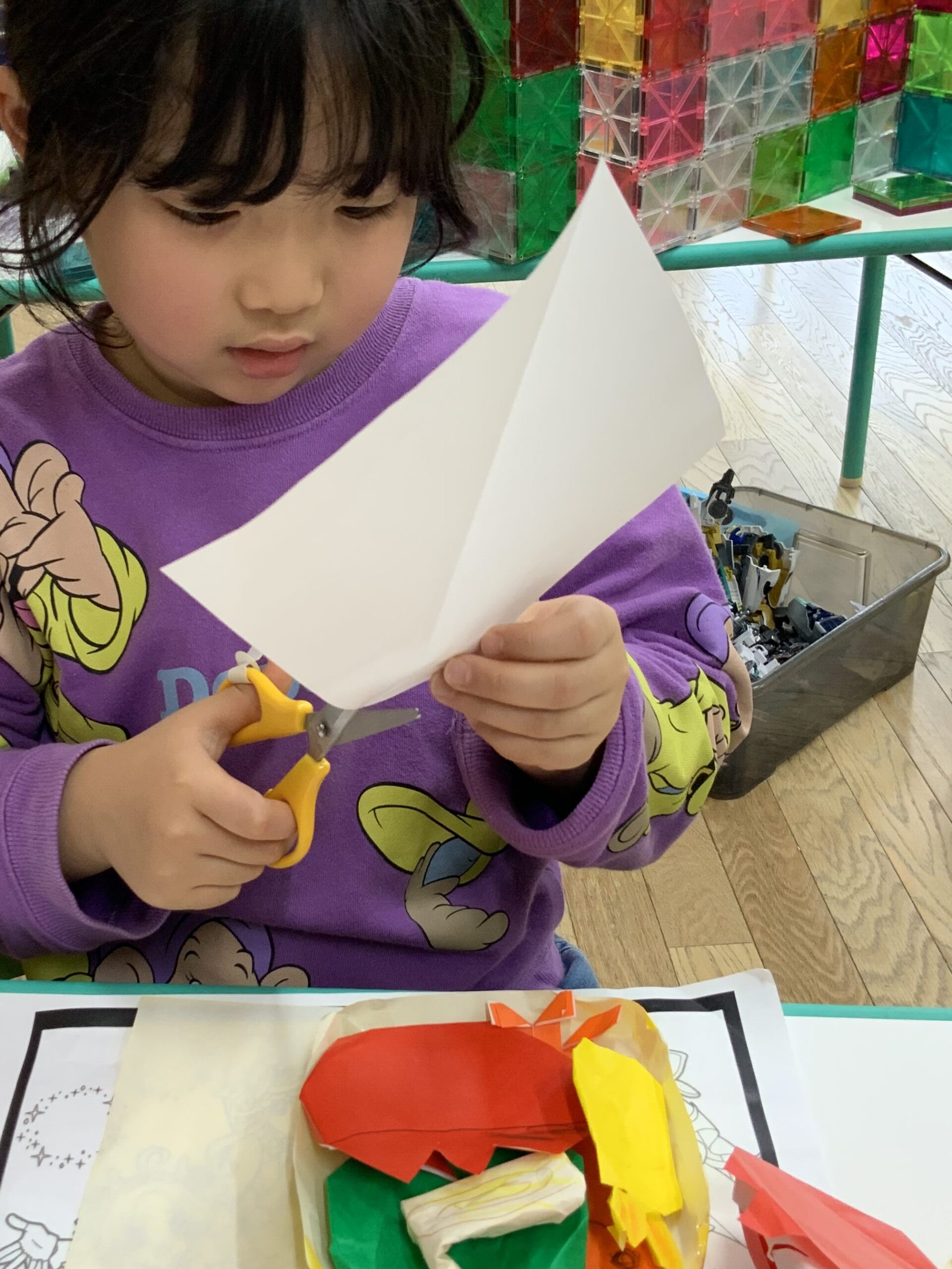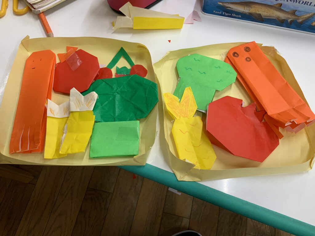 お弁当 2026-03-26 5歳児クラスめろん組🍈 折り紙をしていた女の子たち。「何作ってるの?」と先生。「お弁当」と子どもたち。折り紙の本を見ながら、折り紙でタコさんウィンナーや、エビフライなどを作っていました。「おいしそうだね。先生のも作って欲しいな」と先生。自分たちだけで本を見て上手に作っていました。