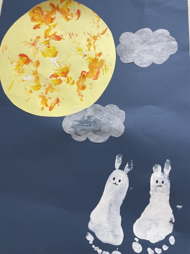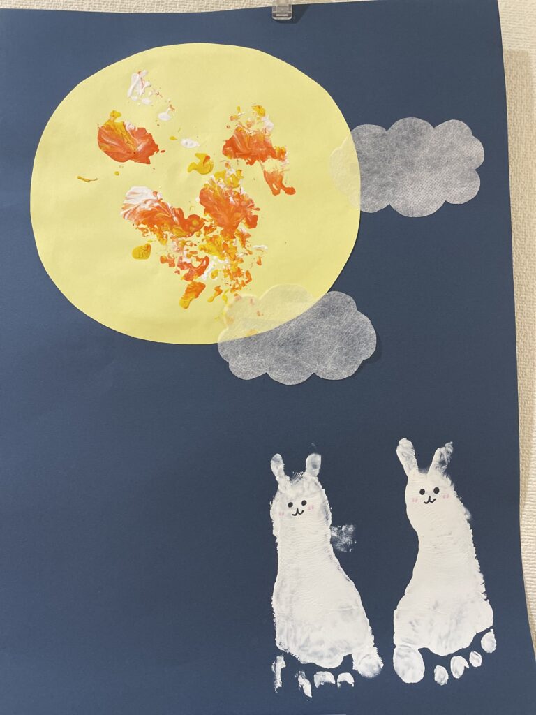 お月見にちなんだ制作をしました。アルミホイルに絵の具を付けてお月様に綺麗な模様をつけました。ウサギさんの体は足型で、耳は指に絵の具を付けて描きました。ウサギさんにお顔を描いて可愛いお月見制作が完成しました。みんな、指先の使い方も上手になってきました。