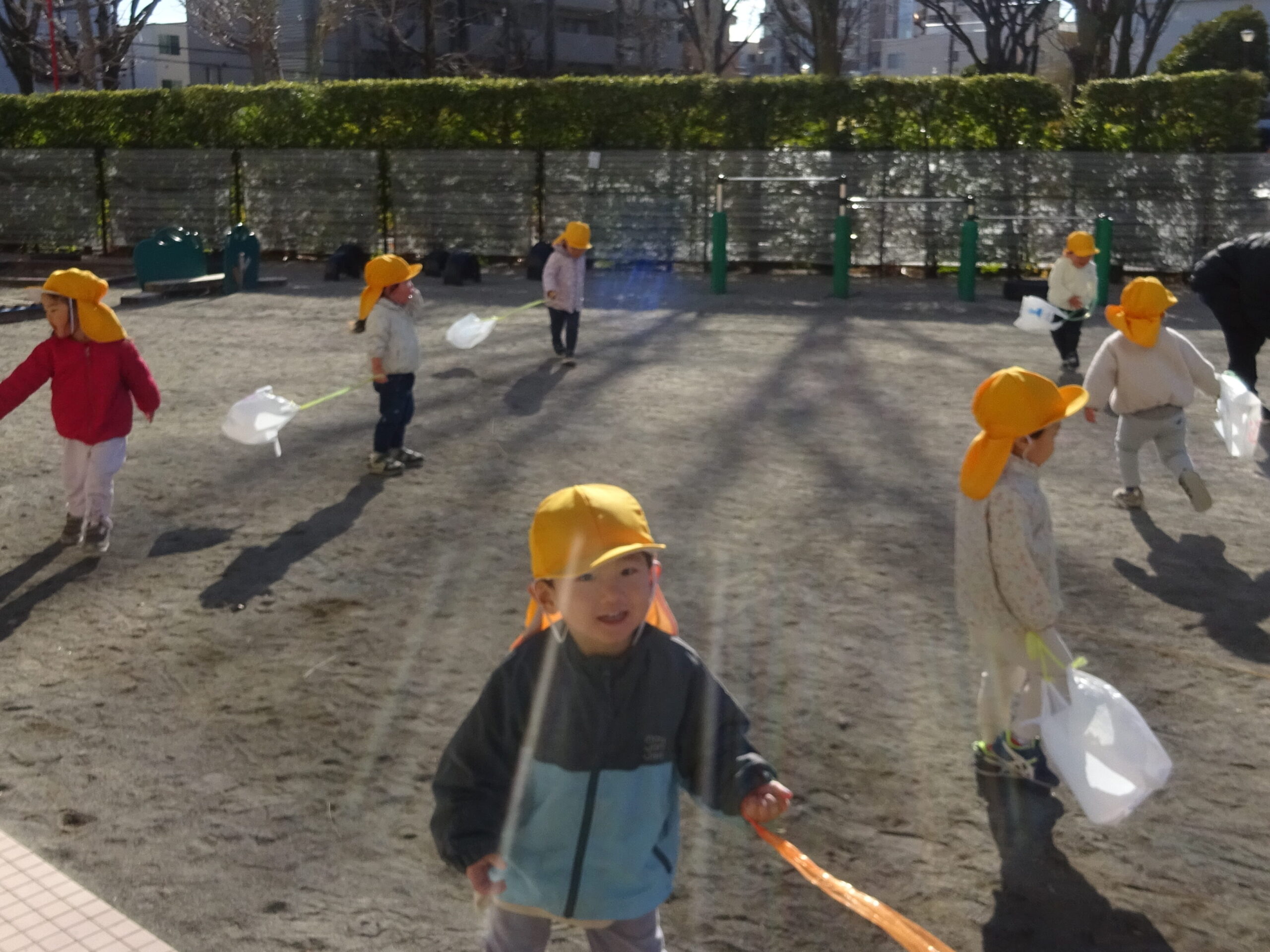 お正月あそび 2026-01-06 皆さま、明けましておめでとうございます。今年もどうぞよろしくお願いいたします。 新年二日目の今日、2歳児みかん組の子どもたちが園庭で凧揚げを楽しみました。風が強かったので、凧が飛んで行ってしまわないように小さな手で頑張って凧を握っていました。風になびく凧に歓声を上げながら大喜びしていた子どもたちでした。 たーこーたーこーあーがれ♬
