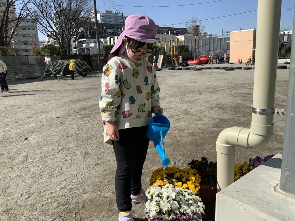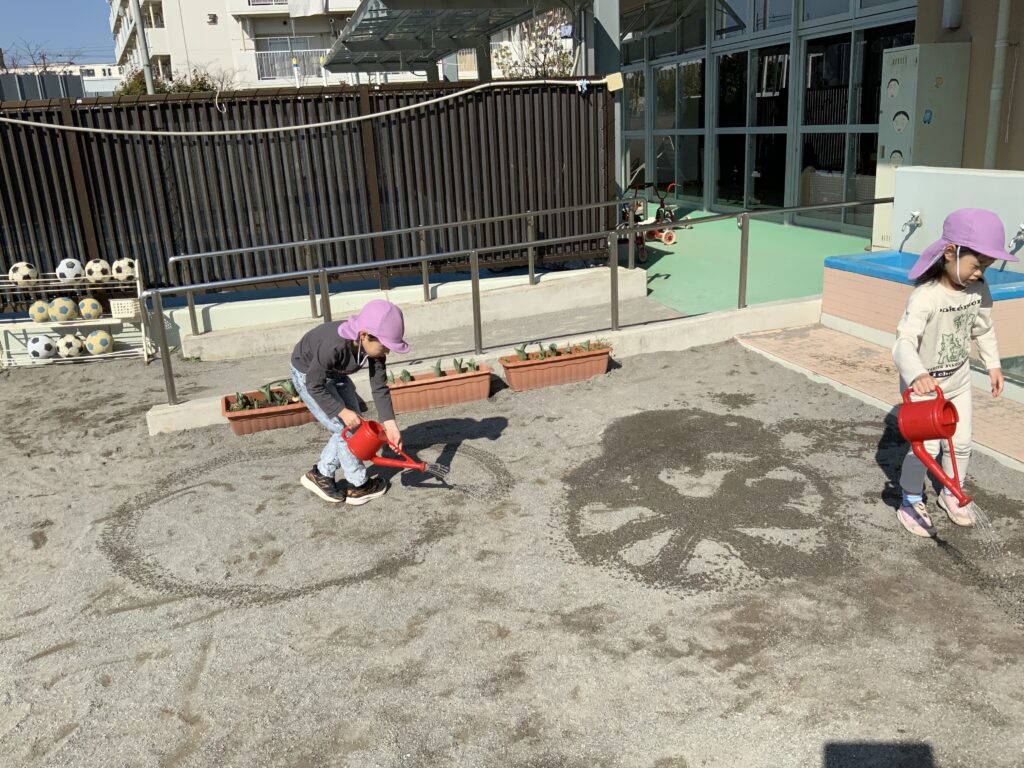 お水 2026-03-21 いつも元気いっぱい、にぎやかな4歳児クラスぶどう組🍇 ぶどう組のお友だちが、園庭のお花にじゅうろで水やりをしてくれていました🌸🌺🌼そこからなんとなしに遊びに広がり園庭に迷路を作ろうという事になったようで、じょうろで上手に迷路を作っていました。
