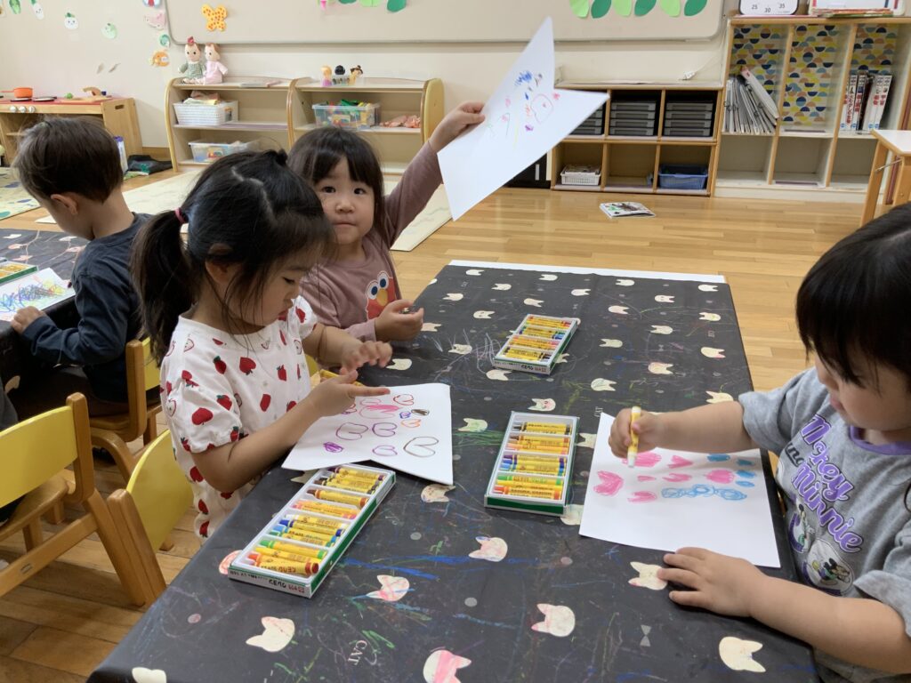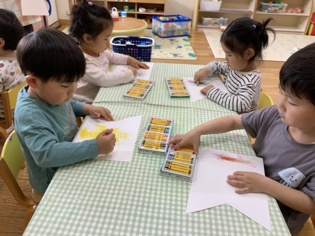お絵描き 2026-04-17 3歳児クラスれもん組🍋 真新しいクレヨンでこいのぼりの制作をしました。一人ひとり、クレヨンを受取りとっても嬉しそう。好きな色を選んで描いていました。完成が楽しみです✨✨✨