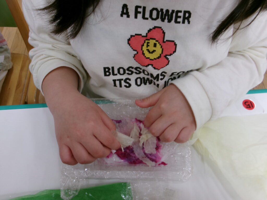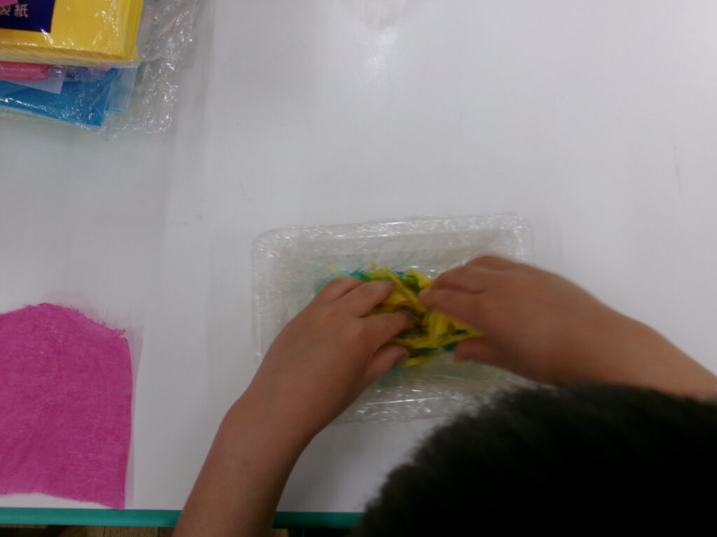 今月の制作をしました。プラスチックの容器の中に、自分の好きなお花紙と、お水を入れて手で押しながら、色んな色の紙を重ねてみました。どんな作品が完成するのか楽しみです。