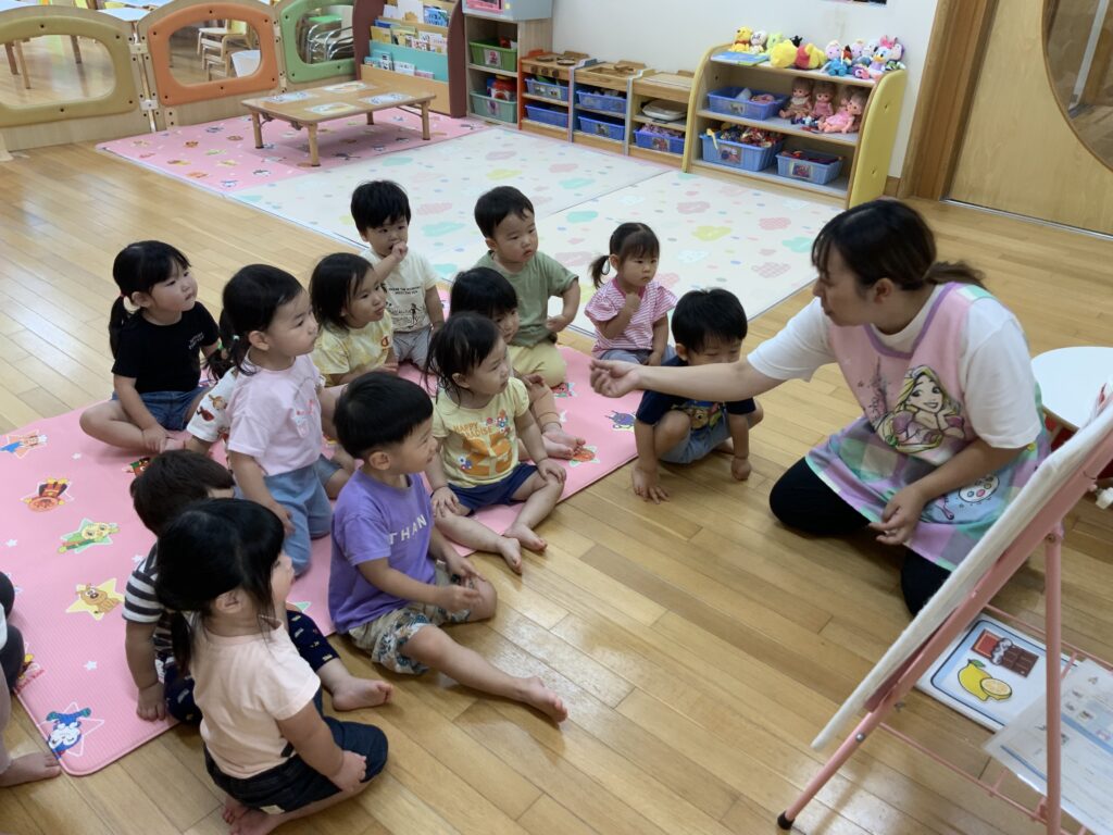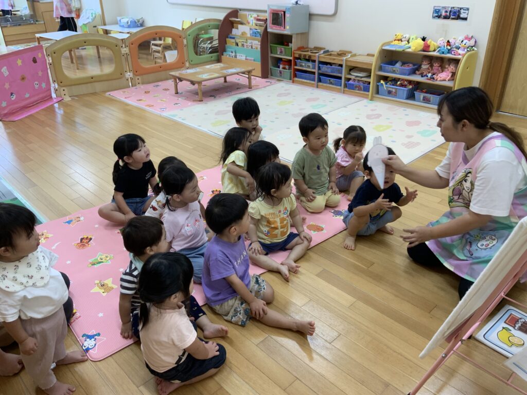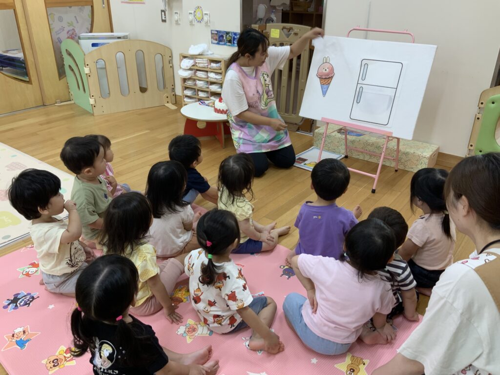 お話し大好き 2025-10-08 笑顔満載の1歳児いちご組🍓 絵本やペープサートも大好き。この日はアイスクリームのお話をすると、目をキラキラさせて見ていました。先生が、アイスクリームを渡す真似をすると、先生の手から受け取って食べる真似をしていました。